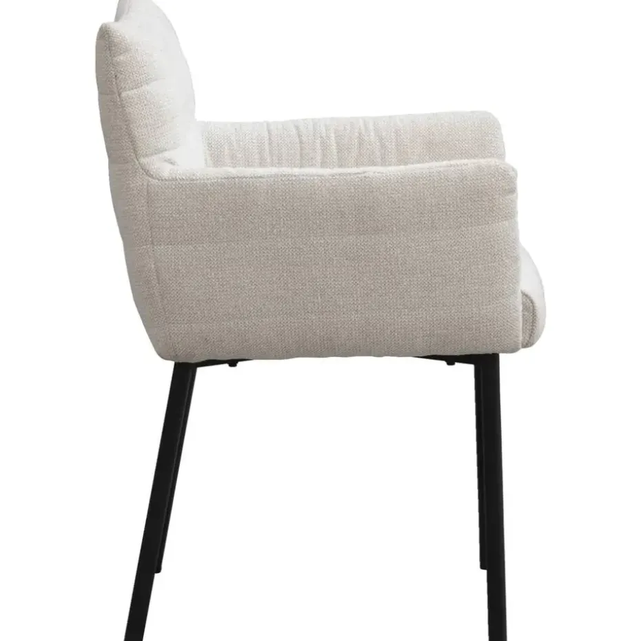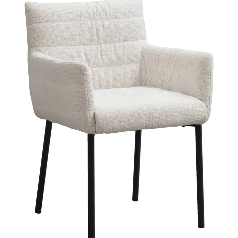 Eetkamerstoel Mees is een extra comfortabele stoel, bekleed met een crèmekleurige stof. De zitting in combinatie met het robuuste, metalen onderstel maakt hem tot de perfecte eetkamerstoel. Stoel Mees heeft een royale zitting met armleuningen, dit zorgt voor een optimaal zitcomfort.