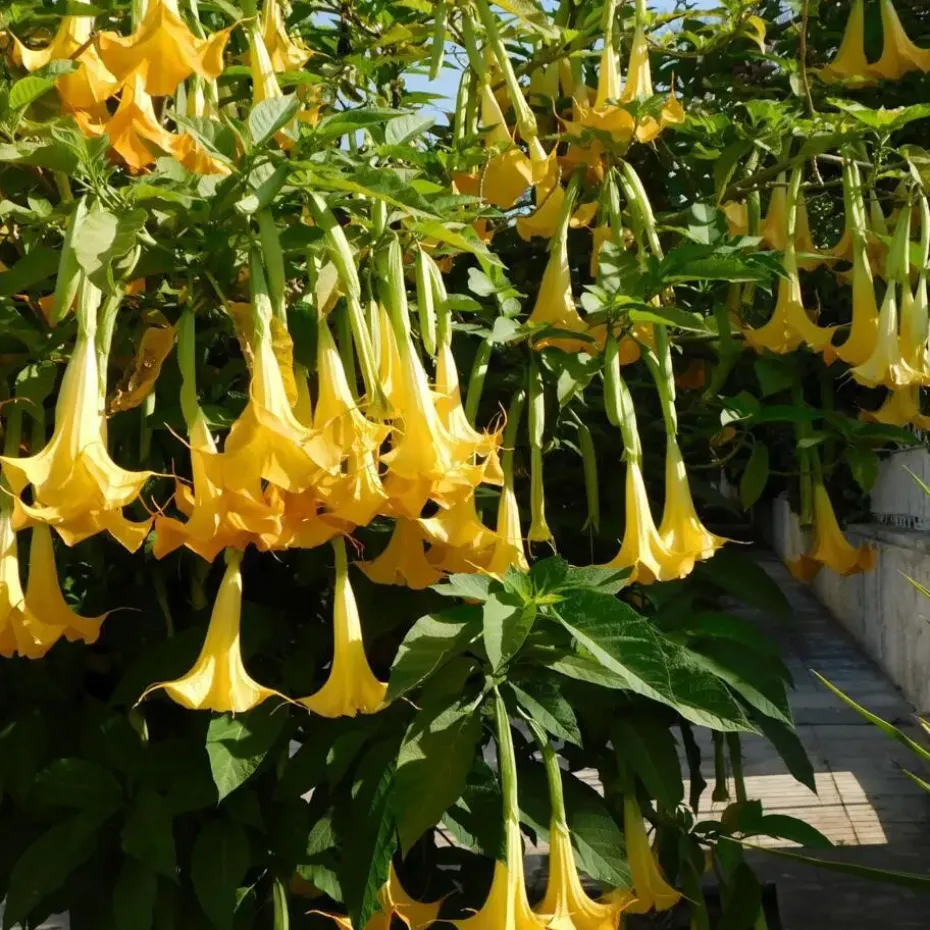 De grote bladeren van de Brugmansia zijn behaard en verdampen tijdens de zomermaanden zo veel dat je er niet aan kunt ontkomen om de Brugmansia dagelijks water te geven. Wees echter voorzichtig: een permanent natte grond kan leiden tot wortelrot. In de winter kan de watergift gespreid worden, laat de grond tussen de gietbeurten uitdrogen, maar niet kurkdroog, anders sterft de plant. Je merkt gemakkelijk wanneer je water moet geven: de bladeren hangen slap als ze water nodig hebben. De Brugmansia houdt van de zomerhitte en overleeft goed in de volle zon.