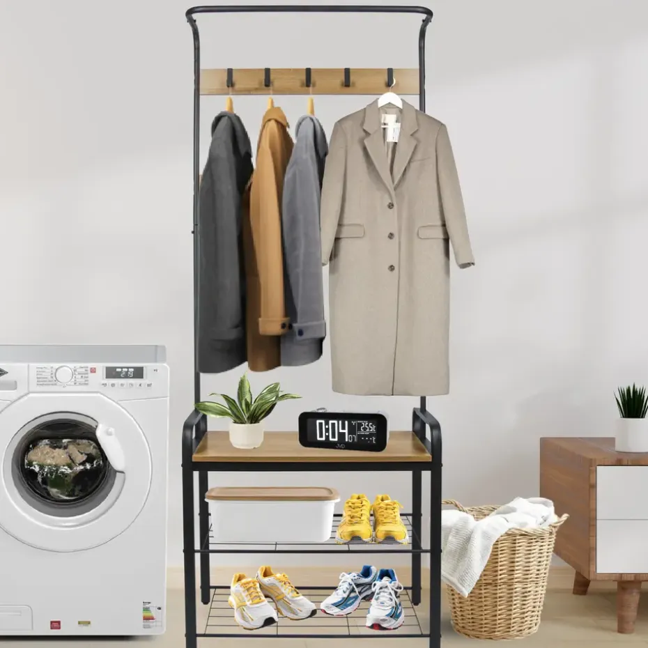 Dankzij de stevige haken aan de kapstok blijft alles veilig op zijn plaats. Zo kun je snel en gemakkelijk bij je spullen. Onderop bevindt zich een ruim schoenenrek met 2 lagen dat plaats biedt aan meerdere paren schoenen. Hierdoor blijft je vloer netjes en vrij van rondslingerende schoenen.