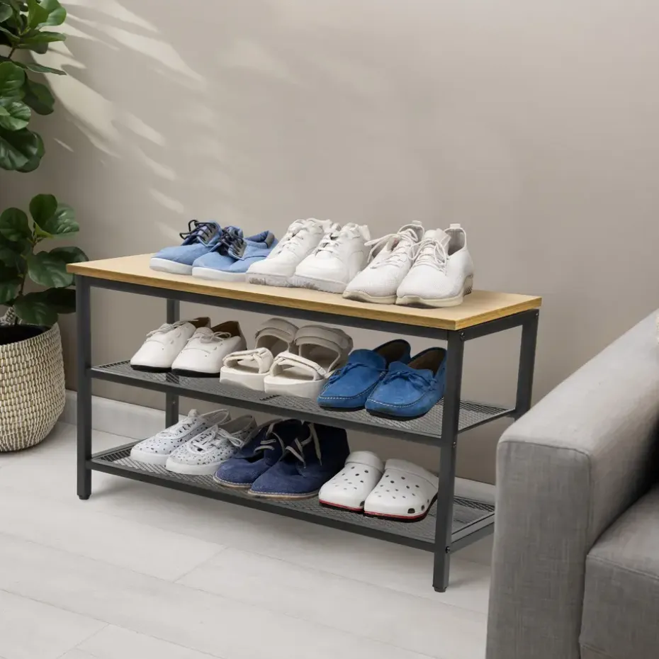 Het ontwerp van het ERRO schoenenrek zorgt voor een stoere uitstraling die perfect past in elk interieur. De combinatie van hoogwaardig mat zwart metaal en houten accenten geeft het schoenenrek een duurzame constructie.