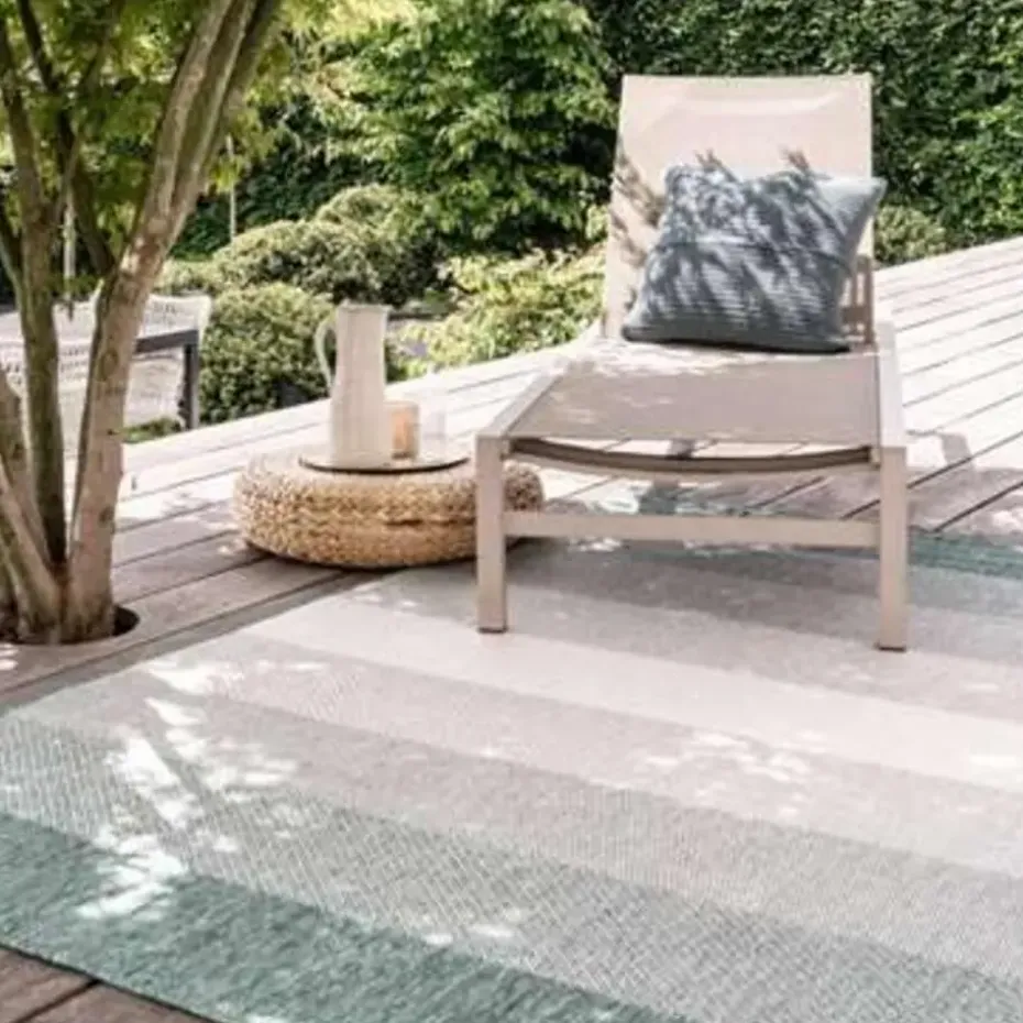 Wat leuk is aan de buitenvloerkleden van Eva Interior is dat ze dubbelzijdig te gebruiken zijn, in een handomdraai heb jij dus een totaal ander kleed met tegengestelde kleuren!