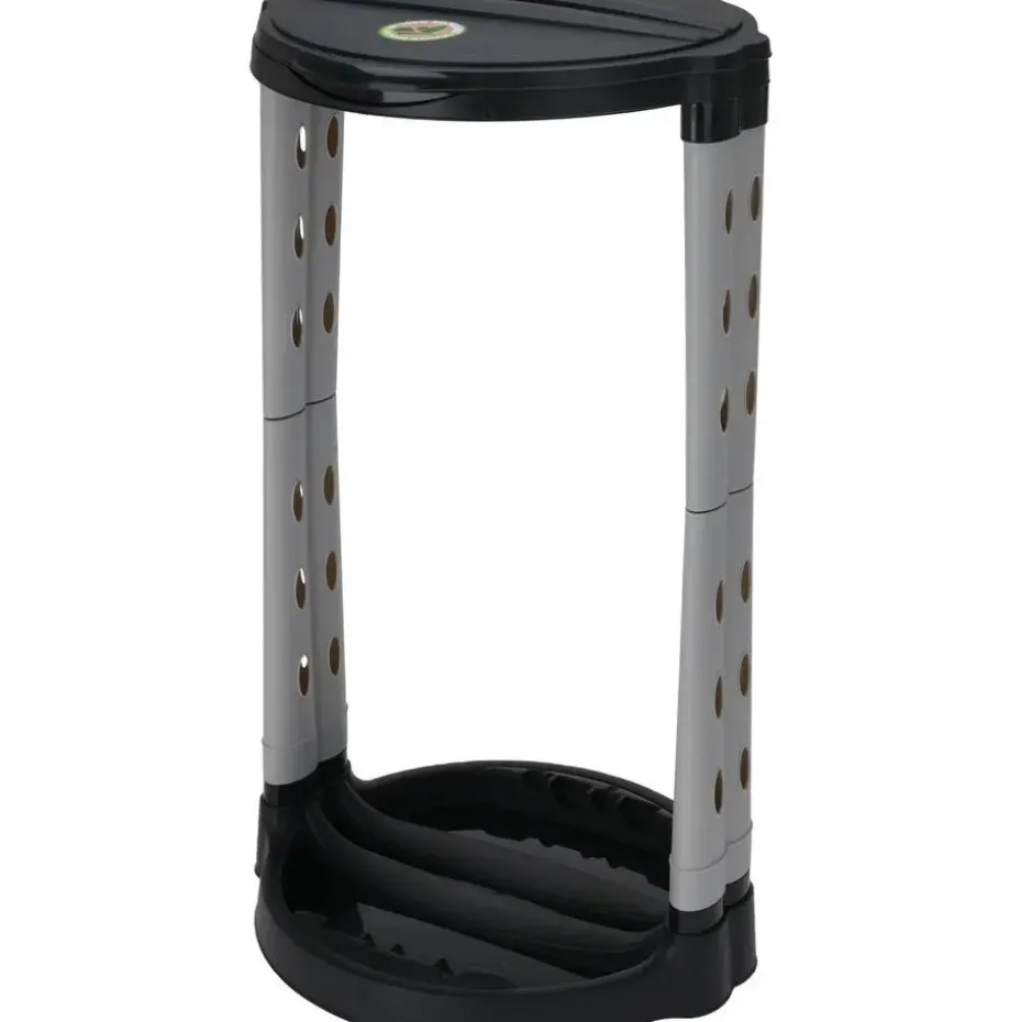 Staande vuilniszakhouder prullenbak/vuilnisbak in het zwart. Handige vuilniszakkenstandaard om een vuilniszak in te hangen. Deze standaard is geschikt voor vuilniszakken tot 120 liter. Materiaal frame: kunststof. Materiaal deksel: kunststof. Afmeting: ca. 43 x 74 cm. Ideale prullenbak/vuilnisbak voor op de camping of voor in de tuin. Exclusief vuilniszak.