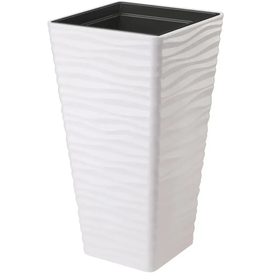 Plantenpot/bloempot uit de Sahara Dunes Slim serie met een stijlvol golvend patroon aan de buitenzijde. De binnenpot is uitneembaar en voorzien van handige handgrepen. Deze bloempotten zijn gemaakt van stevig kunststof in de kleur wit. Deze prachtige bloempot met uniek design is een waar statement aan je tuin, terras, serre of huis. De bloempot is voor buiten en binnen gebruik geschikt. De kunststof constructie van de plantenpot maakt dat de pot licht van gewicht is, waardoor hij makkelijk is te verplaatsten. Afmetingen: D40 x H75 cm. Dankzij de robuuste kunststof kwaliteit zijn deze bestand tegen vorst.