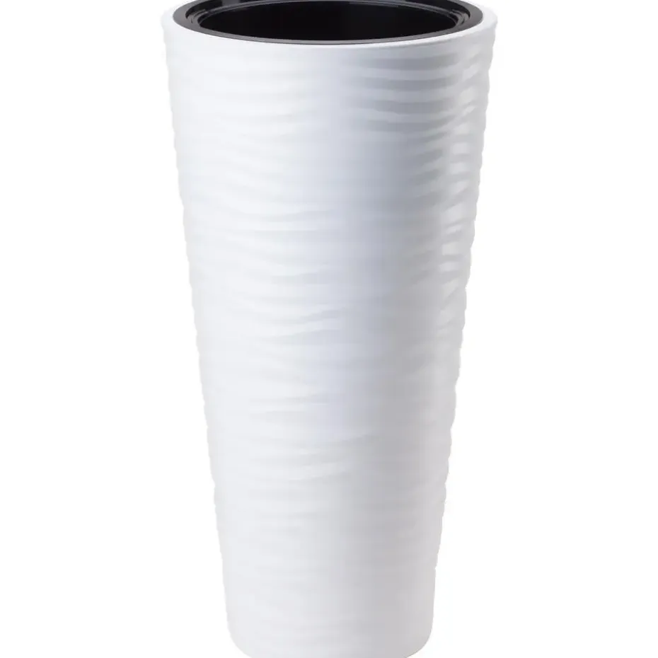 Plantenpot/bloempot uit de Sahara Dunes Round Slim serie met een stijlvol golvend patroon aan de buitenzijde. De binnenpot is uitneembaar en voorzien van handige handgrepen. Deze bloempotten zijn gemaakt van stevig kunststof in de kleur wit. Deze prachtige bloempot met uniek design is een waar statement aan je tuin, terras, serre of huis. De bloempot is voor buiten en binnen gebruik geschikt. De kunststof constructie van de plantenpot maakt dat de pot licht van gewicht is, waardoor hij makkelijk is te verplaatsten. Afmetingen: D35 x H69 cm. Dankzij de robuuste kunststof kwaliteit zijn deze bestand tegen vorst.