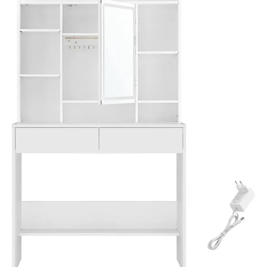 - [Ruim] Deze kaptafel heeft 1 plank voor parfum bovenop, 7 open vakken voor make-up, 2 planken en haken voor sieraden achter de spiegel, 1 grote plank, 2 laden en 1 plank in het onderste gedeelte. Alles vindt hier zijn plaats