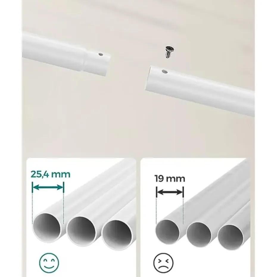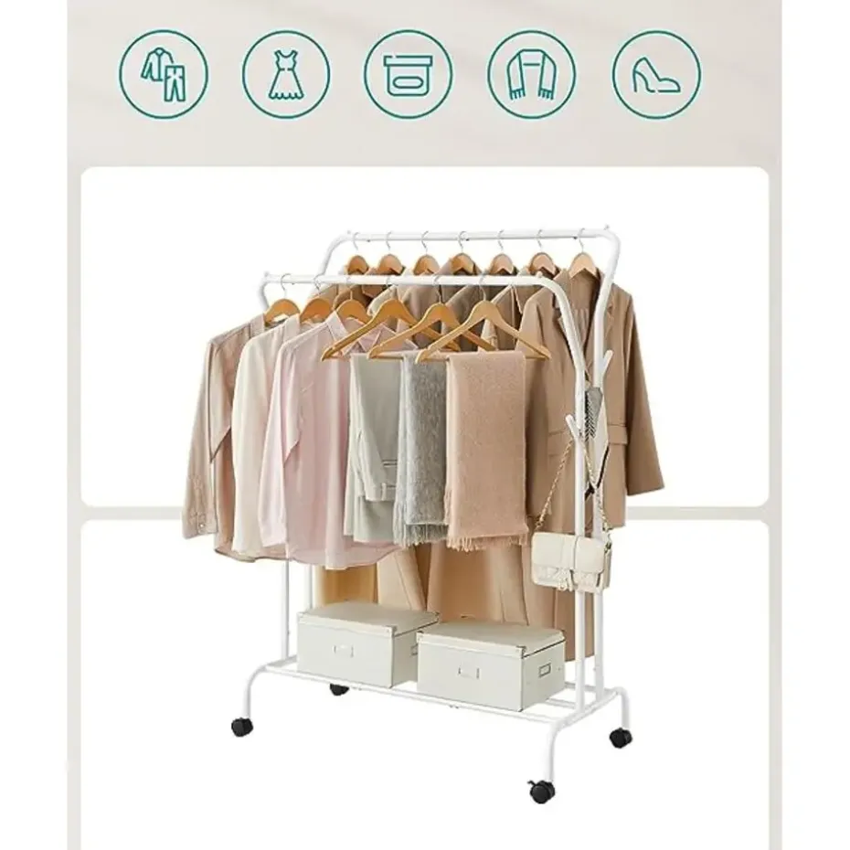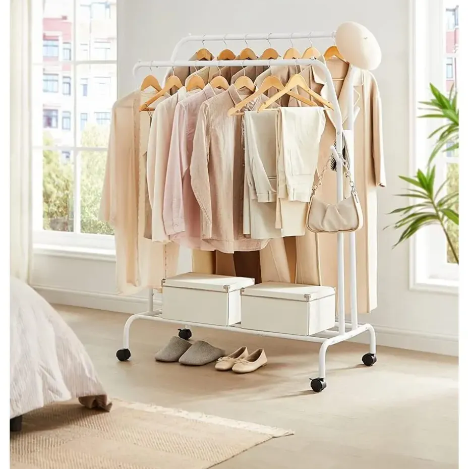 [Veelzijdige opslag] Met een hoge rail en een lage rail voor het ophangen van kleding van verschillende lengtes, haken aan beide zijden voor tassen en hoeden, en een onderste plank voor dozen en schoenen, houdt dit kledingrek al je benodigdheden op één plek [Sneldrogend en gemakkelijk toegankelijk] De afstand van 42 cm tussen 2 kledingophangrails zorgt ervoor dat de lucht gemakkelijk doorstroomt, wat een snelle droging bevordert. Het biedt voldoende ophangruimte om overvolle, rommelige kleding te voorkomen, waardoor ze gemakkelijker toegankelijk zijn [Gemakkelijk te verplaatsen en te vergrendelen] Schuif de dubbele kledingroede moeiteloos naar elke kamer in huis dankzij de 4 zwenkwielen. 2 van de wielen zijn vergrendelbaar, waardoor je het rek ook op één plek kunt bewaren [Stabiel en sterk] Met bouten die de 25,4 mm dikke stalen buizen bevestigen, heeft dit kledingrek een stabiel frame dat tot 100 kg kan dragen. Elke rail heeft een max. statisch draagvermogen van 30 kg; elke haak tot 5 kg; en de onderste plank kan maximaal 20 kg dragen [Eenvoudige montage] De eenvoudige structuur, de genummerde onderdelen en de geïllustreerde, gemakkelijk leesbare instructies maken het opzetten van dit robuuste kledingrek een fluitje van een cent.
