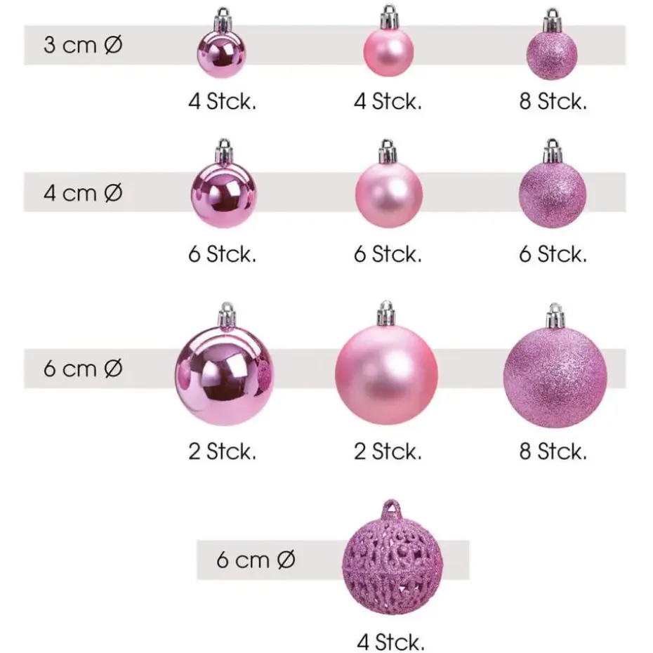 Voeg een vleugje charme toe aan je kerstdecoratie met deze set van 50 onbreekbare kunststof kerstballen in diverse roze tinten. De set bevat een mix van afmetingen (3 cm, 4 cm, en 6 cm) en afwerkingen, waaronder glans, mat, glitter en open relief, voor een dynamisch en luxe effect in je kerstboom.