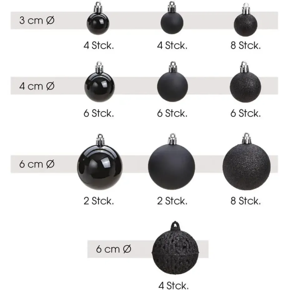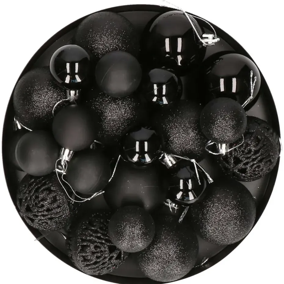 Kerstballen pakket van 50x stuks kerstballen in de kleur zwart. Deze set bevat onbreekbare kunststof kerstballen in diverse afmetingen van 3 cm, 4 cm en 6 cm. De kerstballen zitten in een mix van verschillende afwerkingen: glans, mat, glitter en open relief, wat zorgt voor een dynamisch en luxe effect in je kerstdecoratie.