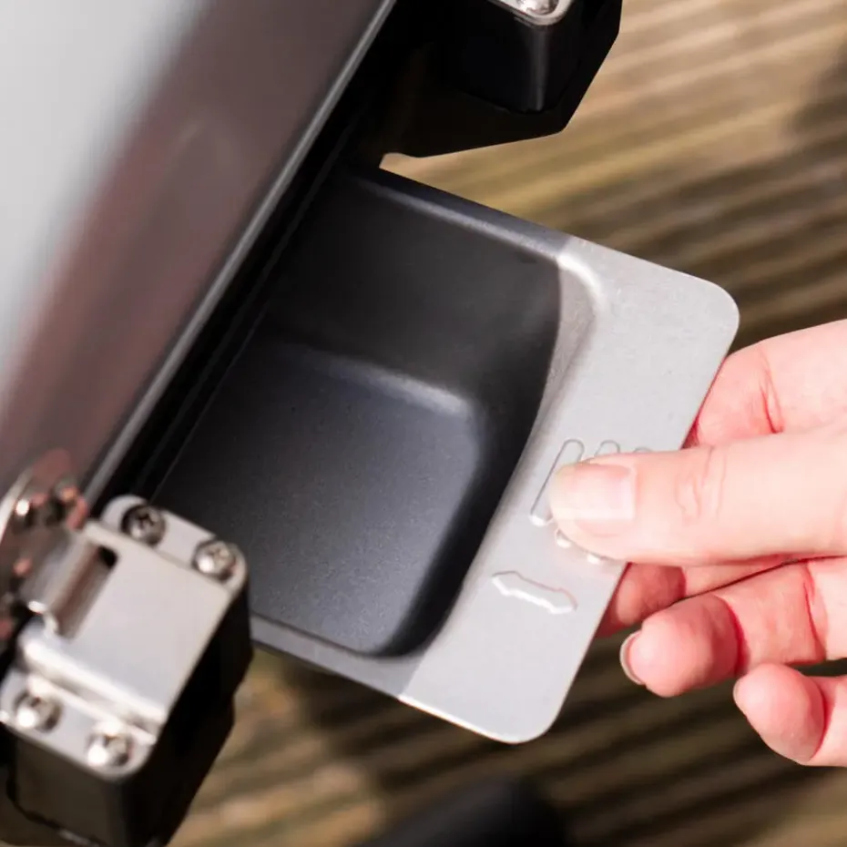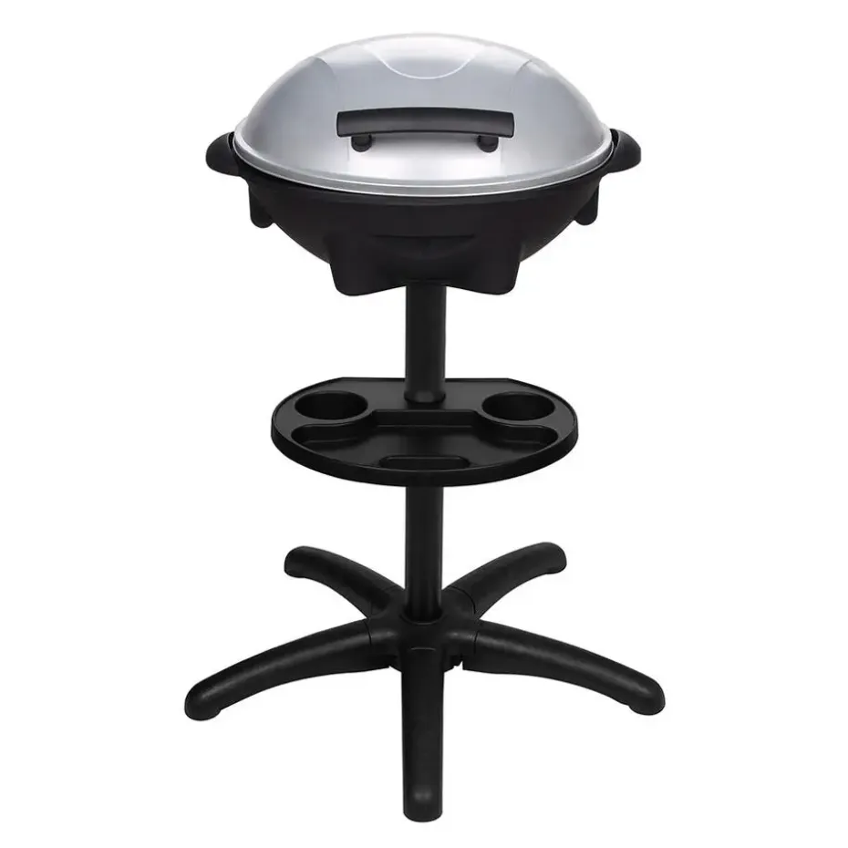 De metalen kap met handvat kan dienen als windscherm of om het eten warm te houden wanneer de kap gesloten is. Het handige demontabele statief met opbergmogelijkheid biedt ruimte voor bestek, sauzen en drankjes, terwijl de afneembare grill en het deksel deze barbecue transformeren tot een handig tafelmodel.