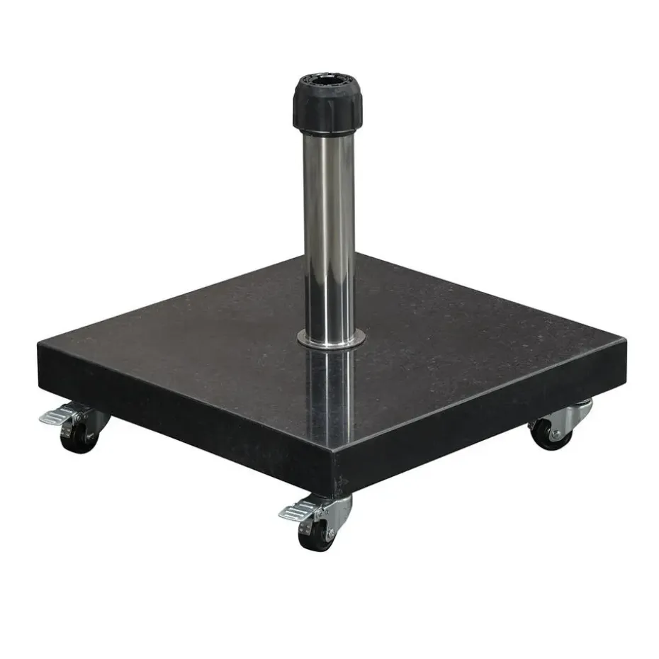 De Eureka parasolvoet is vervaardigd uit zwart kleurig graniet waarvan de bovenzijde is gepolijst, waardoor de voet een strakke en luxe uitstraling krijgt. Deze parasolvoet is voorzien van vier nylon wielen waardoor je de voet eenvoudig kunt verplaatsen. De buis waarin de parasol geplaatst kan worden is eveneens gemaakt van RVS met een kunststof binnendop. Graniet is een natuurproduct wat zijn eigen unieke kenmerken heeft. Het kan voorkomen dat in de granieten parasolvoet een ader van de steen zichtbaar is. Dit doet geen afbreuk aan de kwaliteit van het product.