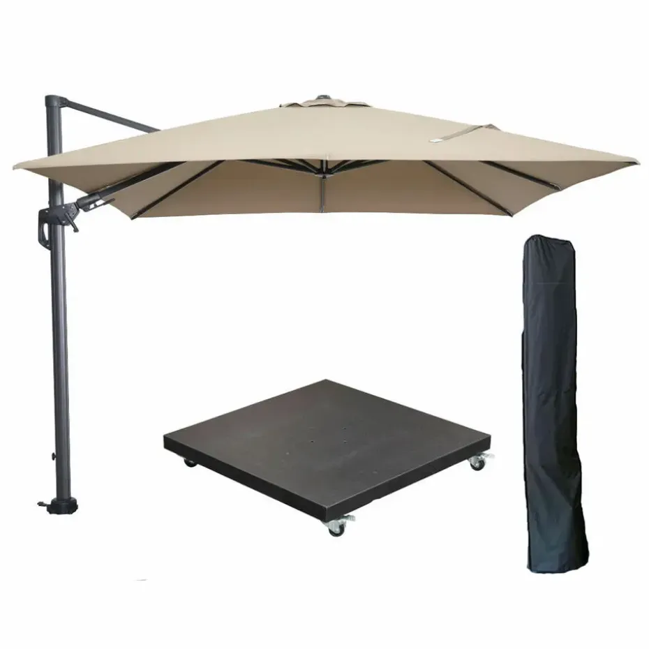 Bij de Hawaii parasol wordt een luxe granieten voet van 90 kg met vier wielen geleverd. Hierdoor is de parasol set gemakkelijk te verplaatsen. De parasolvoet heeft een mooie black polish afwerking. Na gebruik kun je de parasolhoes over de ingeklapte parasol doen waardoor je langer van jouw parasol kunt blijven genieten. Bij slecht weer raden wij aan om de parasol op te bergen in de schuur.
