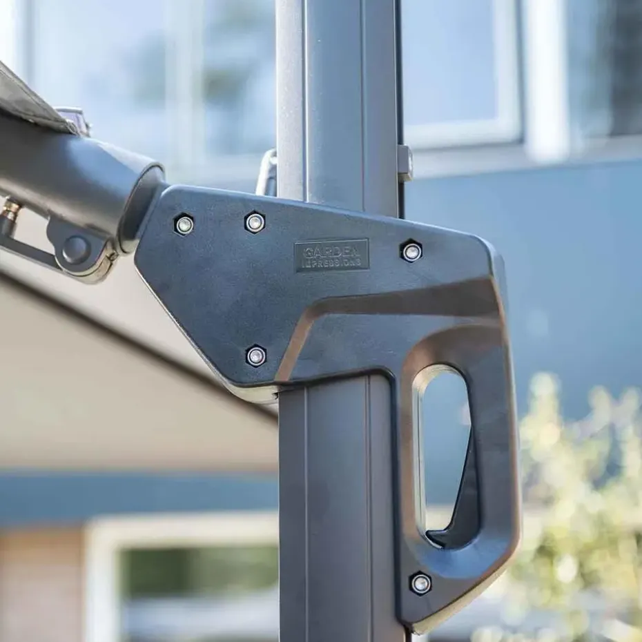 Deze mooie zweefparasol beschikt over een 250 grams spatwaterdicht parasoldoek. Dit doek heeft een brandwerende PA-coating en een windvanger, zodat de wind goed weg kan. Daarnaast beschikt de parasol over zelfspanners die ervoor zorgen dat het doek strak blijft zitten.