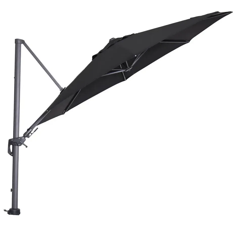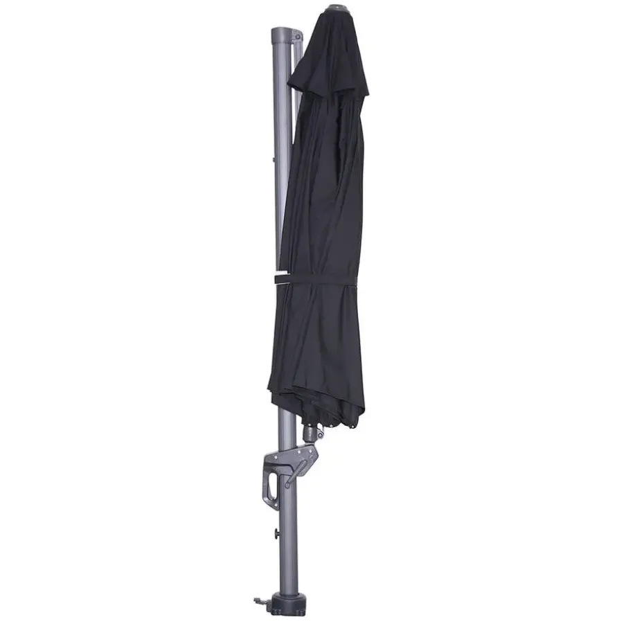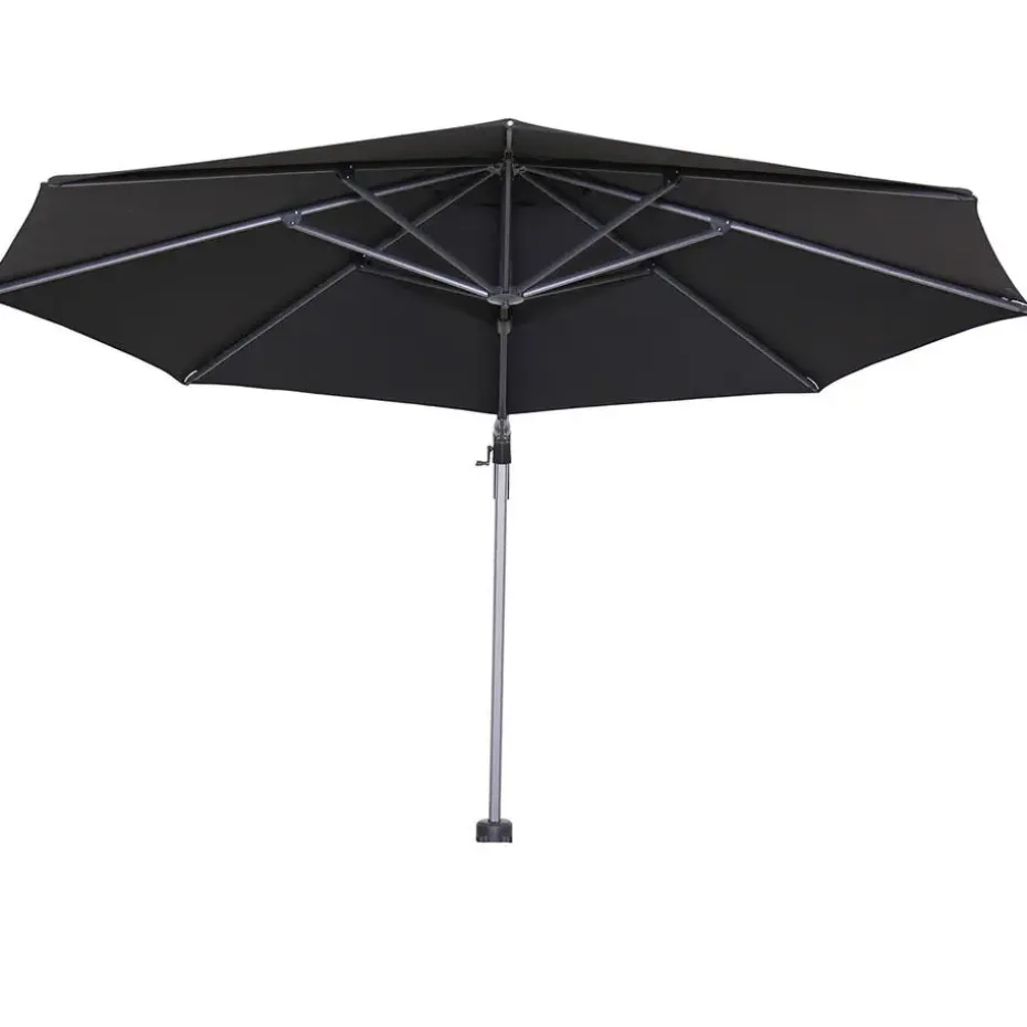 De totale hoogte van deze parasol is 250 cm, de doorloophoogte is 205 cm. De afmetingen van het zwart kleurige doek zijn: Ø350 cm.