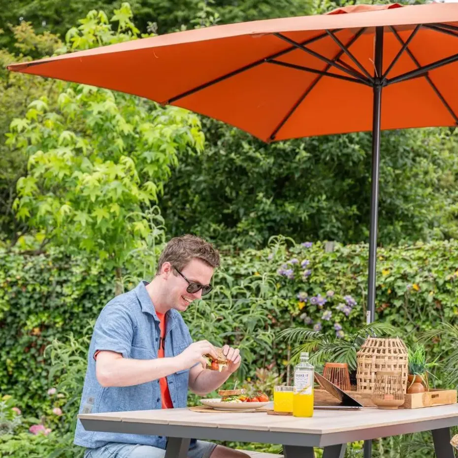 De Lotus parasol is door de lichte materialen erg licht van gewicht en daarom voor de meeste mensen gemakkelijk om te tillen. Deze parasol wordt geleverd exclusief parasolvoet. De diameter van de parasolbuis bedraagt 38 mm. Bij deze parasol van Garden Impressions kan het beste een 30 of 40 kg voet worden gekocht. Wanneer er veel wind staat dan is het vaak beter om de zwaardere voet aan te schaffen. Denk bijvoorbeeld aan plaatsing op een dakterras of bij een boerderij. Deze parasol heeft een Aluminium frame in de kleur carbon black met een polyester koper kleurig parasoldoek. De totale hoogte exclusief voet is 250cm, de doorloophoogte van het doek is 225 cm en de oppervlakte van 300×300 cm