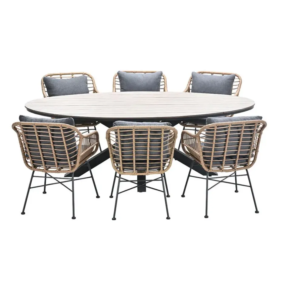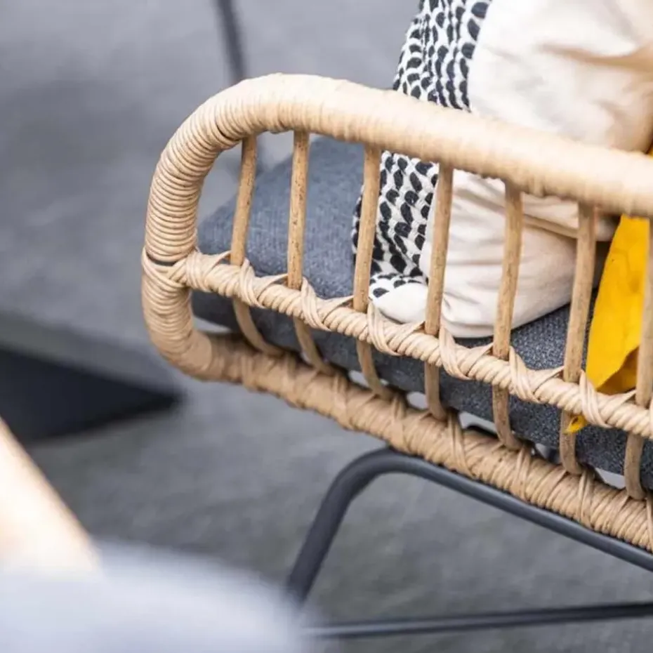 De Tulli tuintafel is een aluminium tuintafel met hout kleurig vironwood. De Lucas dining fauteuil is vervaardigd uit een onderhoudsvrij aluminium frame met daaromheen hoogwaardige kwaliteit natural kleurig vlechtwerkdraad. Deze combinatie zorgt gegarandeerd voor een kwalitatief hoogwaardige dining fauteuil. De poten van de relax fauteuil zijn gemaakt van e-coated staal. Dit is een stevige coating die via elektronisch geladen verfdeeltjes is aangebracht.