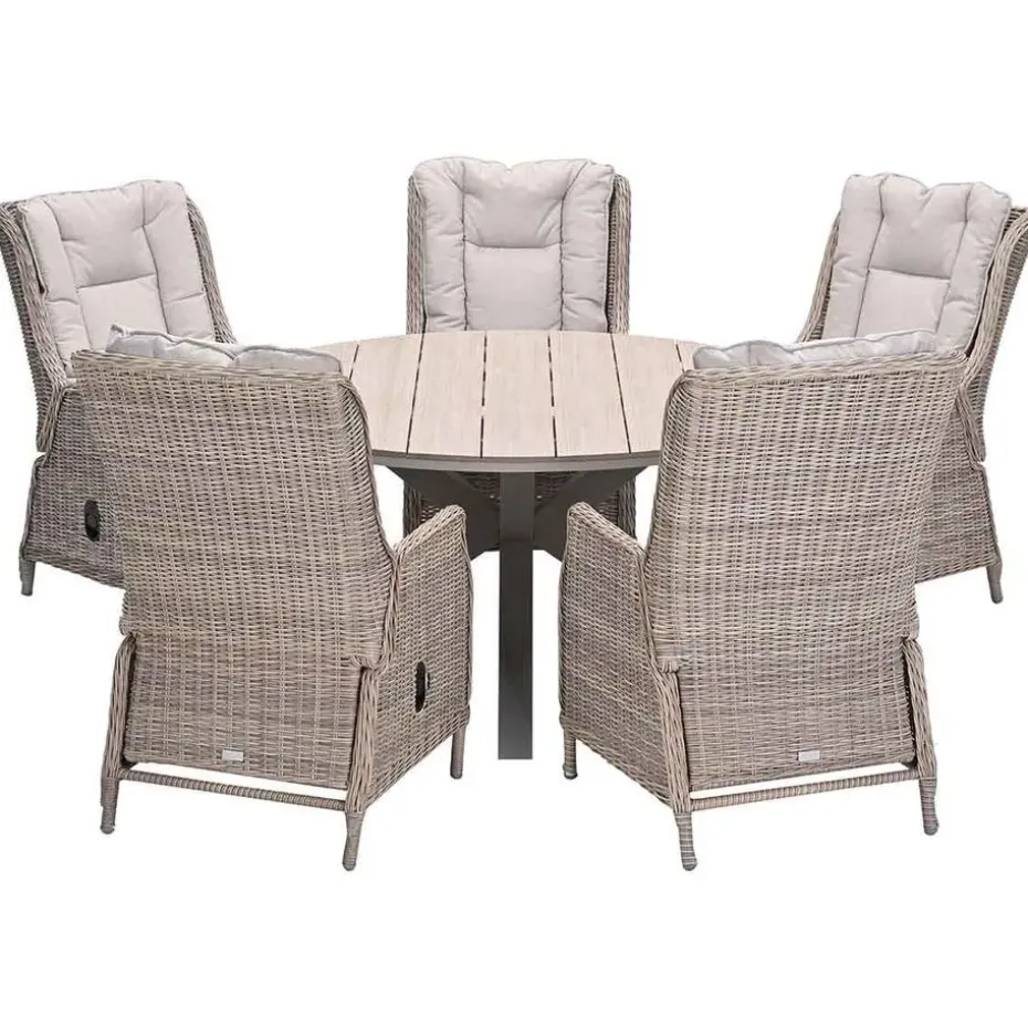 De tuinstoel heeft een afmeting van 62 bij 80 cm en is 105 cm. De tuinstoel heeft een hoge rugleuning ideaal voor wanneer je wat langer bent. De ronde tuintafel heeft een doorsnede van 148 cm en is 75 cm hoog. De hoogte tot de onderkant van het tafelblad is 69,5 cm. Het tafelblad heeft een prachtige houtlook uitstraling.