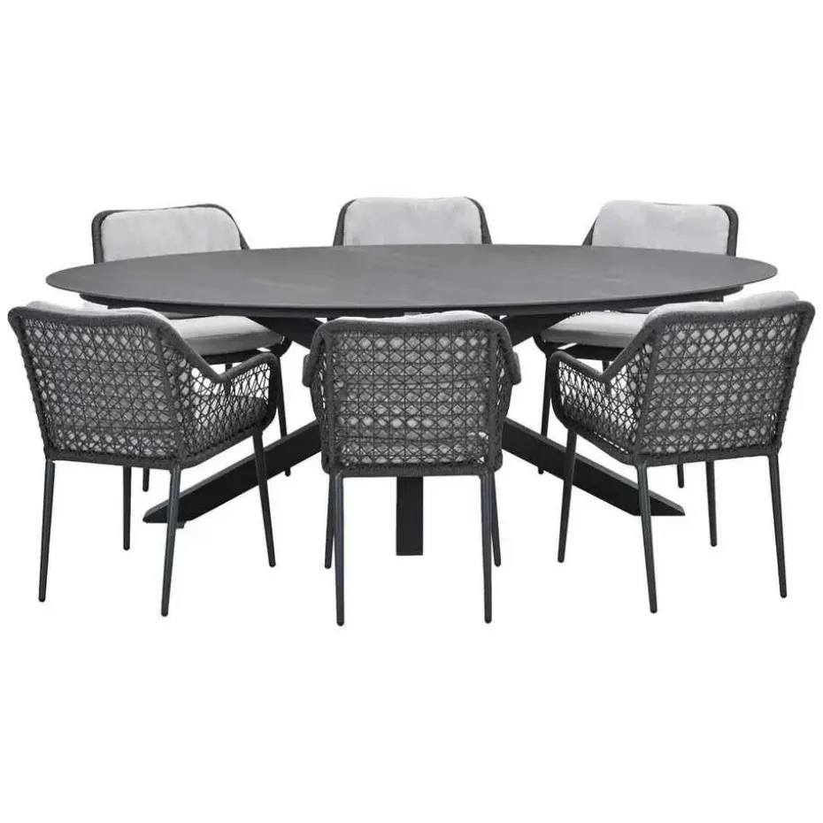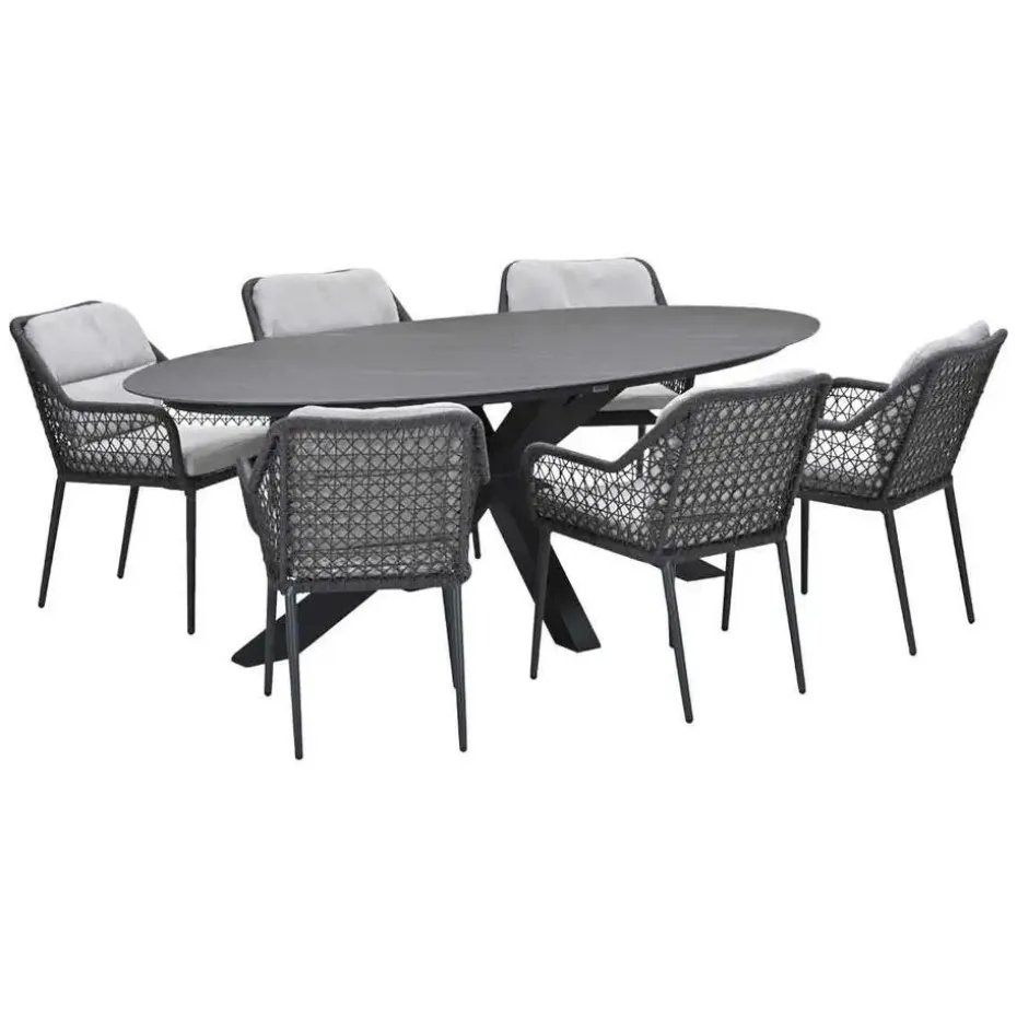 De tuintafel heeft een ovale vorm met de afmeting: 230 x 115 x 76 cm. Het tafelblad heeft de kleur Napoli grey. De Pemba tuinstoel heeft een hoge rugleuning en is 83 cm hoog. De lengte van de tuinstoel is 59,5 bij 63 cm breedte.