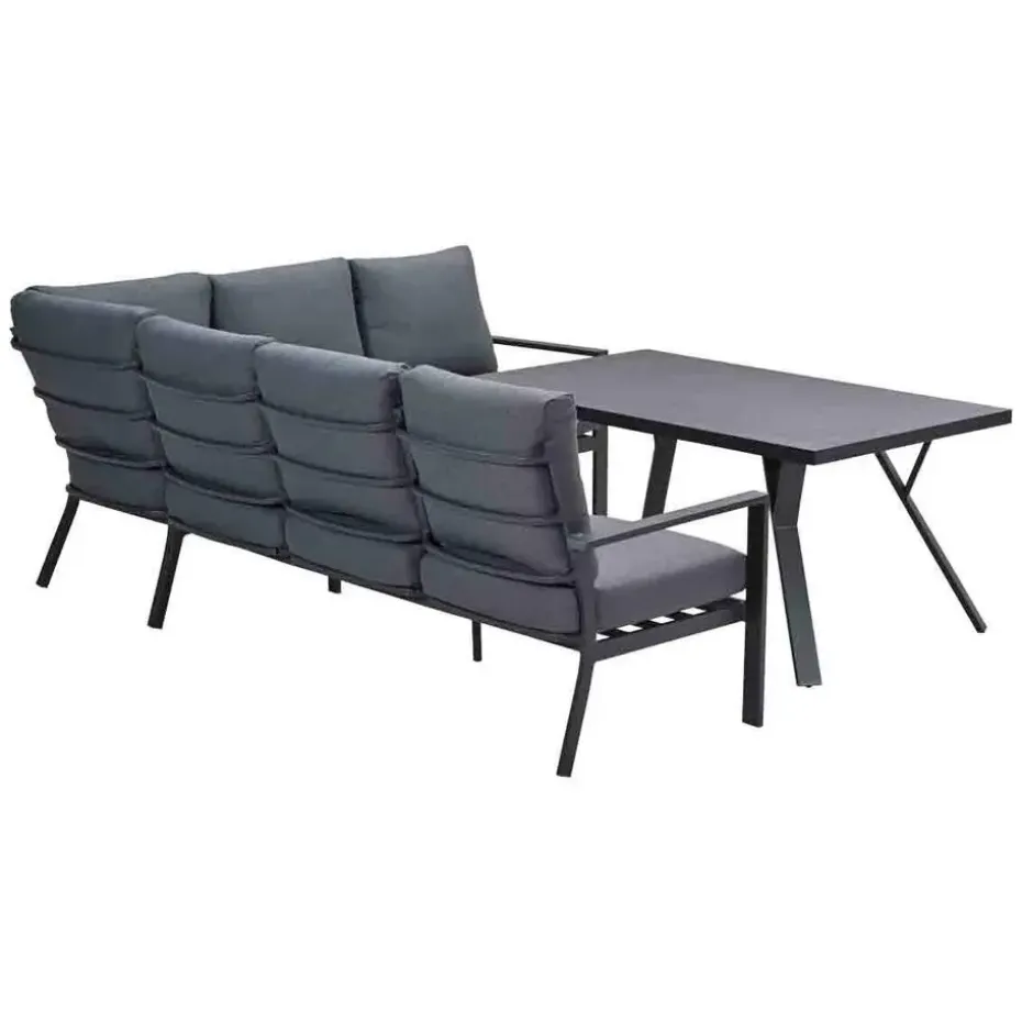 De Senja lounge dining set is vervaardigd van onderhoudsvrij en weerbestendig aluminium, voorzien van een duurzame donker grijze poedercoating. Dit maakt de set gemakkelijk te onderhouden. Als de set vies wordt door bijvoorbeeld opspattend regenwater, kun je deze moeiteloos reinigen met een sopje van groene zeep en een zachte doek. Deze veelzijdige lounge dining set kan worden uitgebreid met een lounge dining stoel en een sportbankje. De tafel heeft een lattenstructuur en brede platte tafelpoten, wat het geheel een strak en eigentijds design geeft. Bovendien beschikt de set over verstelbare pootdopjes, waardoor je de set gemakkelijk waterpas kunt zetten.
