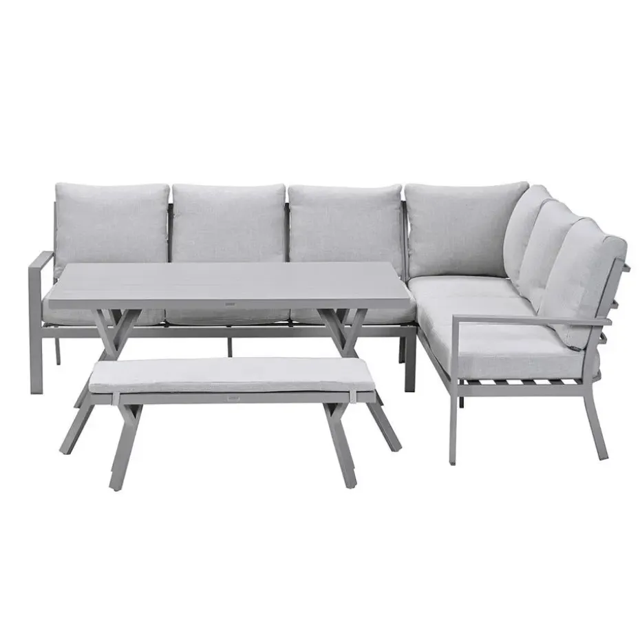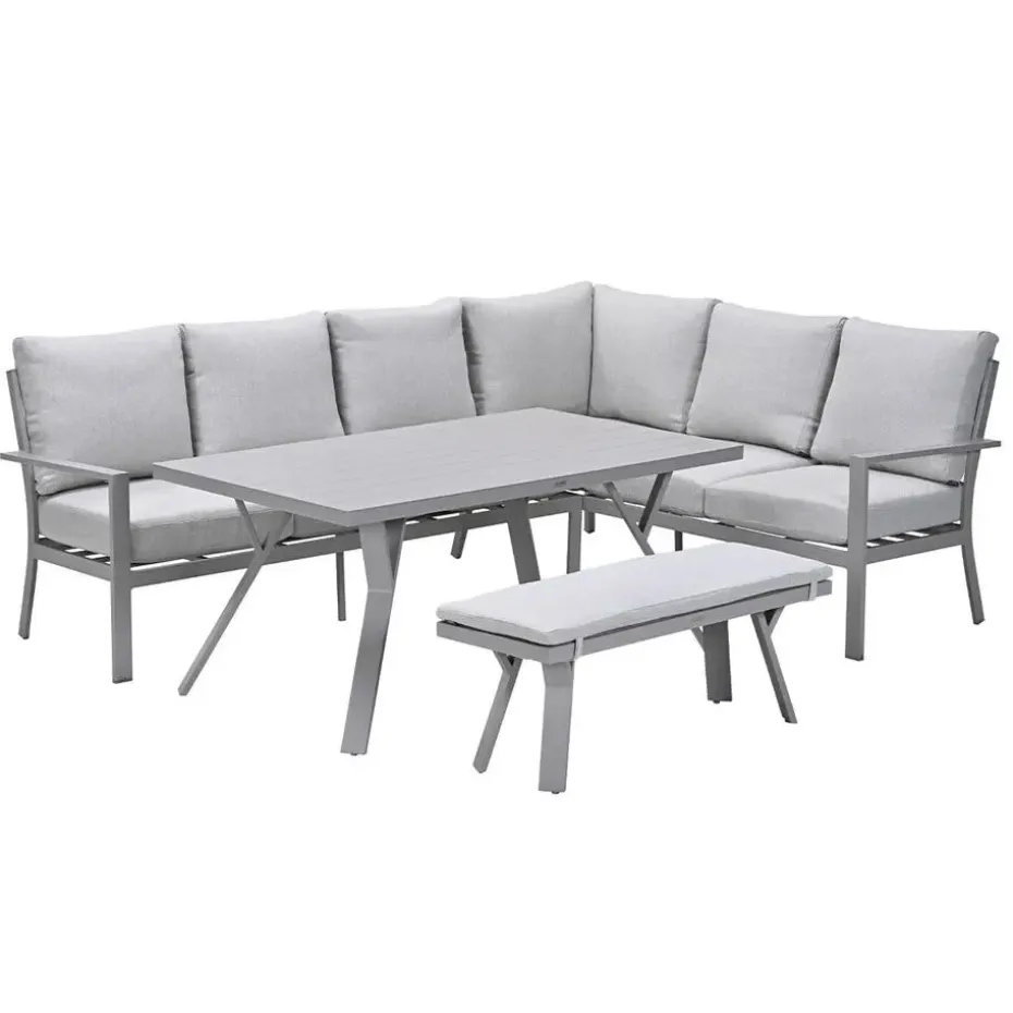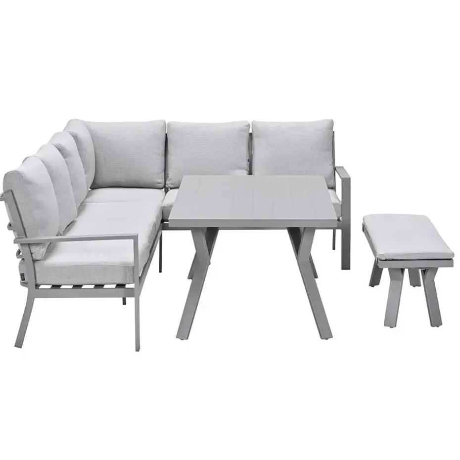 De Senja lounge dining set is vervaardigd uit een onderhoudsvrij en weerbestendig aluminium met een stevige taupe kleurige poedercoating. Aluminium heeft als voordeel dat het onderhoudsvrij is, wanneer de set vies is geworden door bijvoorbeeld opspattend regenwater kan je dit eenvoudig schoonmaken met een sopje van groene zeep en een zachte doek. Ideaal! De lounge dining set is uit te breiden met een lounge dining stoel en een sportbankje. De tafel heeft een latten structuur en brede platte tafelpoten, hierdoor heeft de tafel een strak design. De lounge dining set is voorzien van verstelbare pootdopjes, hierdoor is deze makkelijk waterpas te zetten.