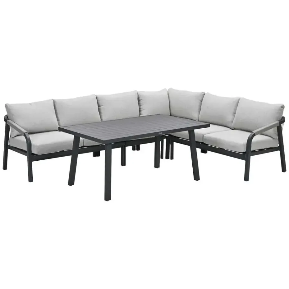 Deze lounge dining set bestaat uit twee twee persoons banken, één midden element en één hoekelement. Hiermee wordt een mooie hoekbank gerealiseerd, gecombineerd met een lounge dining tafel.