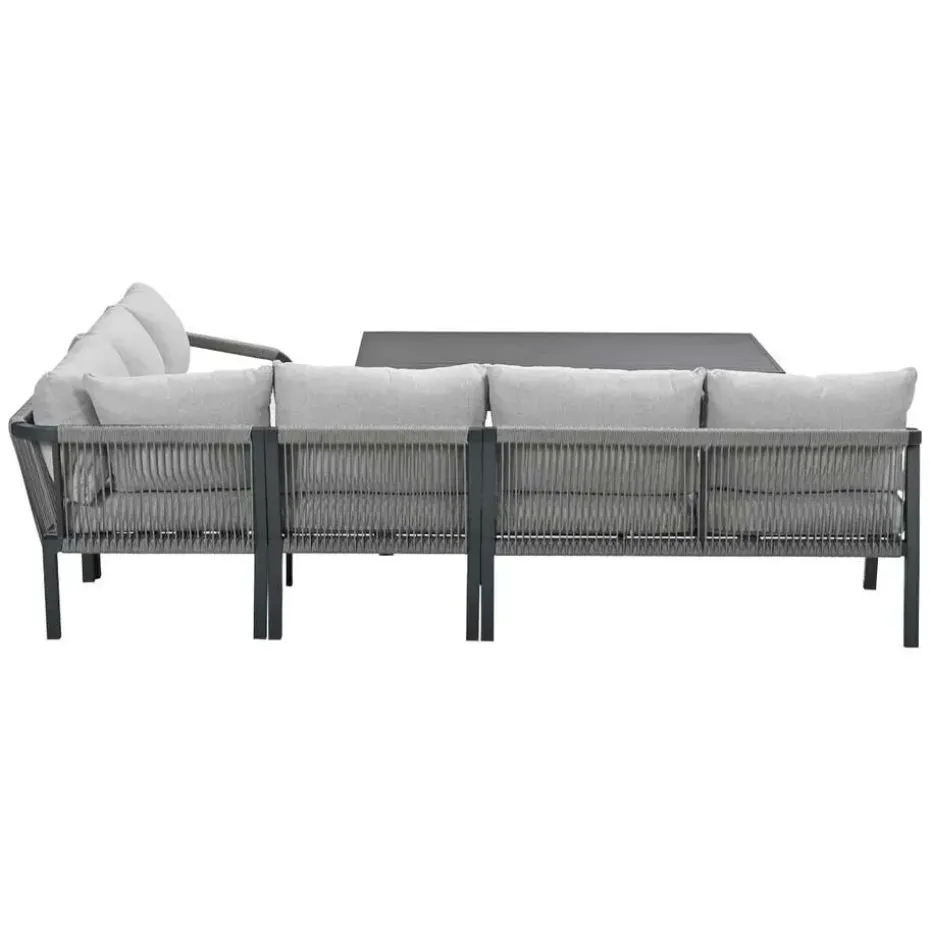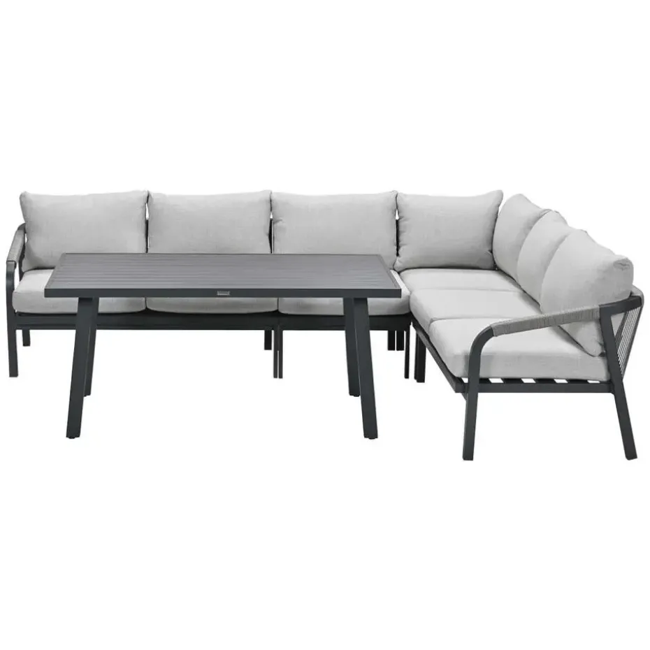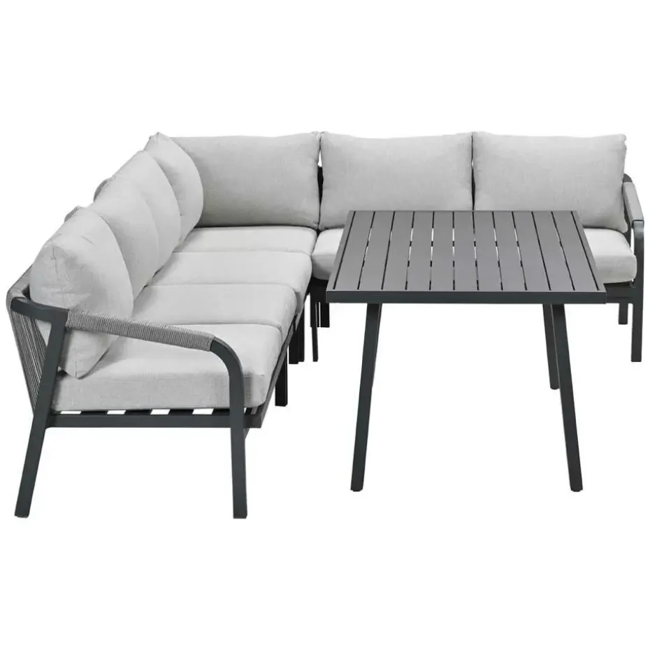 Deze lounge dining set is vervaardigd uit aluminium samen met rope. Rope is de nieuwste trend op het gebied van tuinmeubelen. Deze complete lounge dining set is vervaardigd uit een weerbestendig en onderhoudsvrij frame van aluminium. Het frame is voorzien van een stevige carbon black poedercoating. Dit frame heeft een mooie afwerking van rope touw, dit touw heeft een taupe kleur.