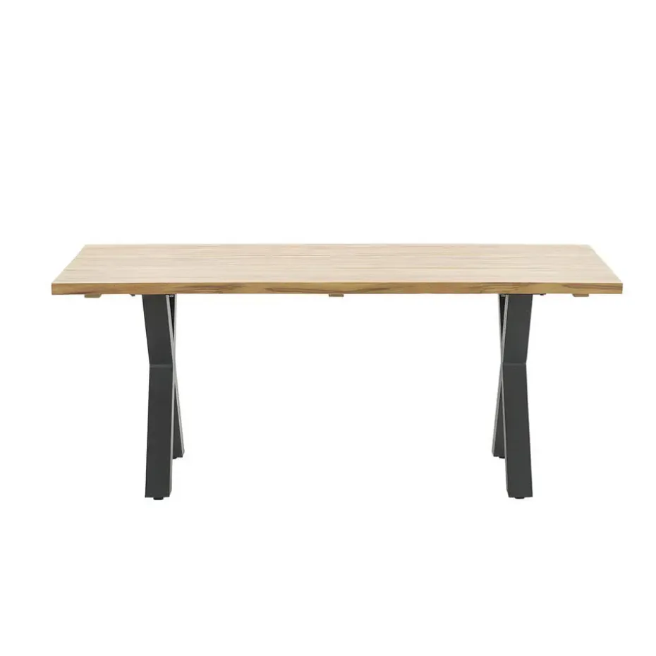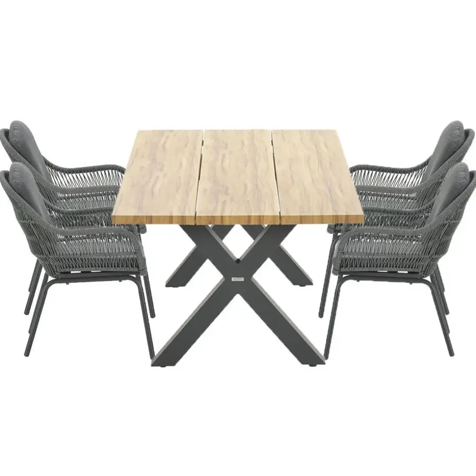 Het tafelblad heeft een afmeting van 180 cm en heeft een X-style tafelframe. Aluminium is schoon te maken met een sopje met groene zeep en lauw water. Voor het drogen kun je het beste een pluisvrije doek gebruiken. Aluminium kan vies zijn geworden door opspattend regenwater of gemorst drinken bijvoorbeeld. Dit is eenvoudig schoon te maken met een sopje en een zachte doek. Het solution dyed polyester touw is eenvoudig te reinigen met een zachte borstel en de cleaner voor touw van Garden Impressions. Als het touw goed is gereinigd met de cleaner dan afspoelen met voldoende water. Wanneer het touw weer droog is dan dient het weer behandelt te worden met een beschermer. De beschermer zorgt er weer voor dat jouw touw water afstotend is. Het is aan te raden om dit minimaal twee keer per seizoen te doen en vooral de tastbare delen. Na ontvangst dient de tuintafel nog gemonteerd te worden. De poten dienen nog aan het blad gemonteerd te worden. Dit is op een gemakkelijke manier zelf te doen door de bijgeleverde handleiding en montage benodigdheden.