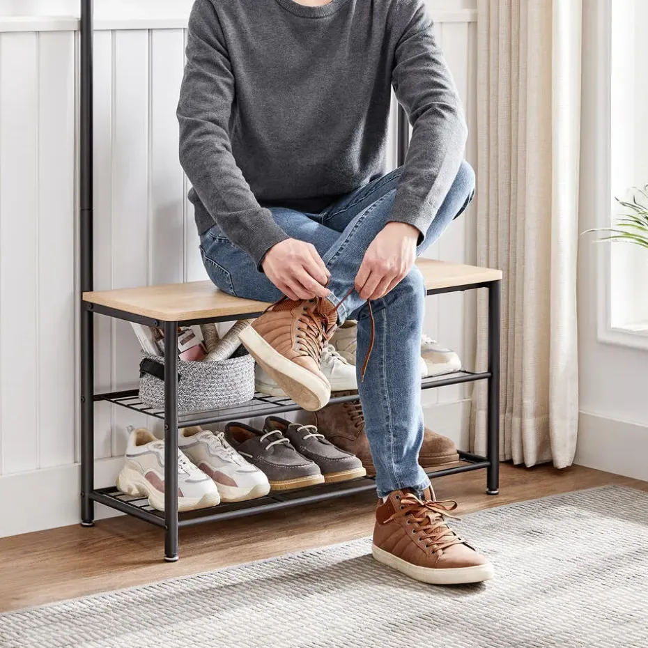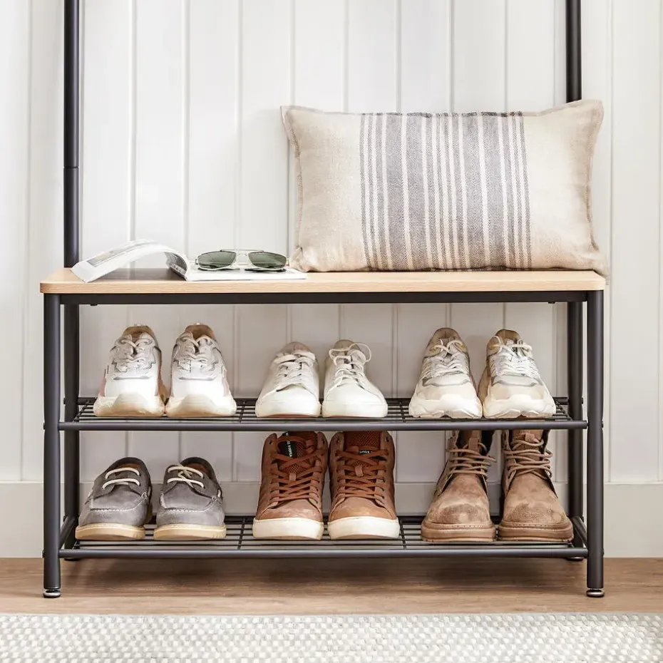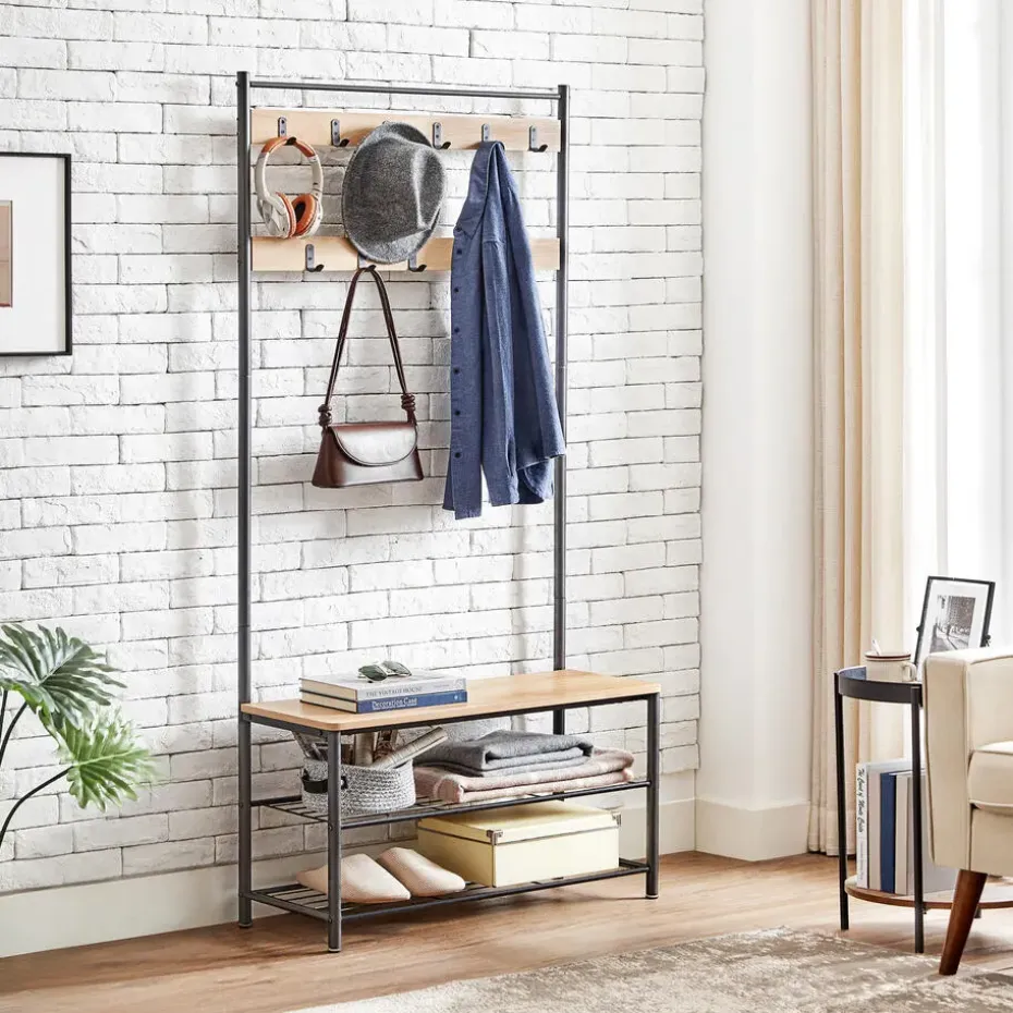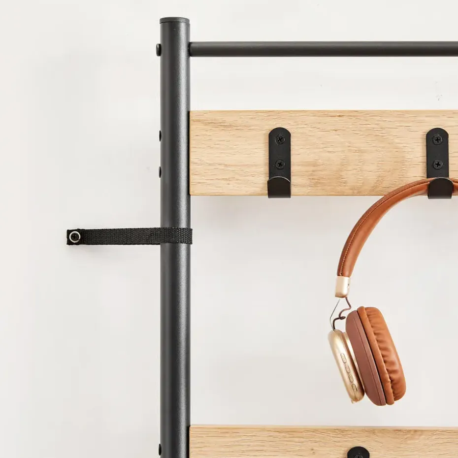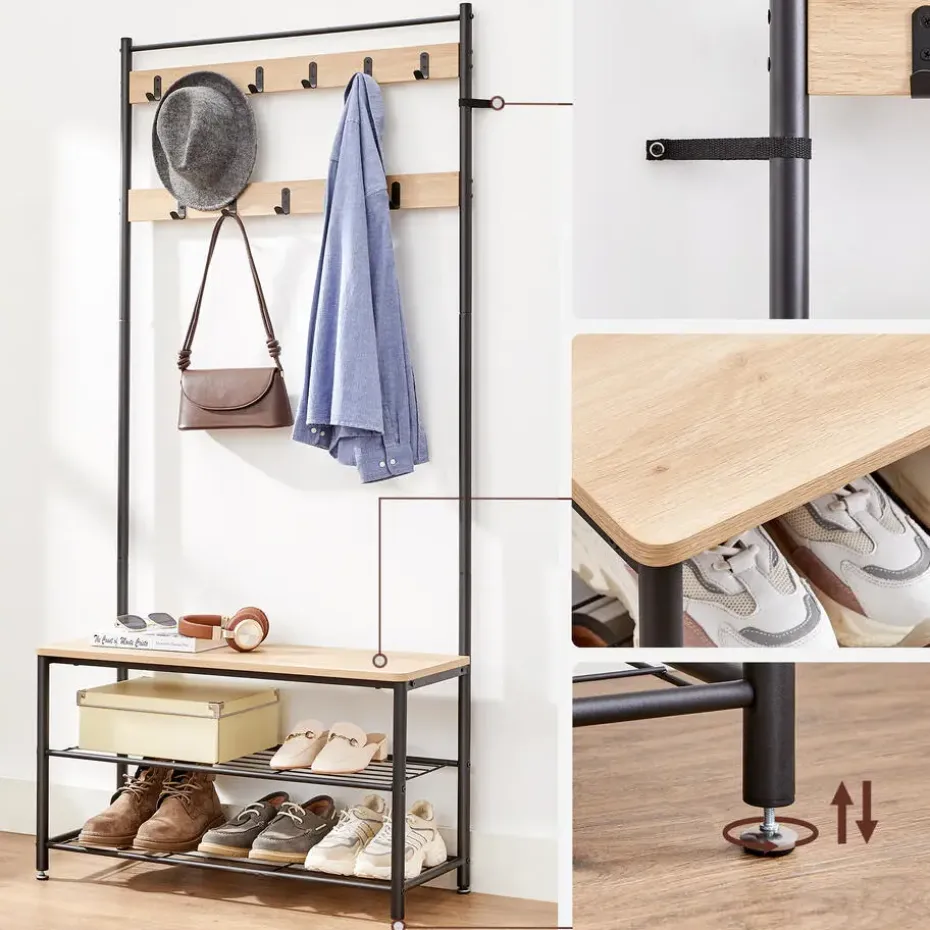 Trendy, praktisch én origineel, het zijn slechts enkele kenmerken van dit multifunctioneel garderoberek. De kleurencombinatie van lichte eik en zwart, zorgt voor een warme en uitnodigende look. Het garderoberek beschikt over 11 haken. Meer dan voldoende ruimte dus voor jouw jassen, tassen of sjaals. En dat is nog niet alles! Er is ook een schoenenrekje waarop je zo’n 8 paar schoenen kan zetten. Wij zijn er zeker van: dit garderoberek is een must-have in de inkomhal!