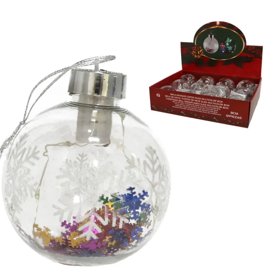 Verlichte kerstbal met sneeuwvlok confetti/strooisel aan de binnenkant. Deze prachtige kerstbal, met een diameter van 8 cm, straalt een warme gloed uit dankzij de 5 LED lampjes aan de binnenkant, waardoor je kerstboom een magische uitstraling krijgt. Het unieke kenmerk van deze kerstbal is de sneeuwvlok confetti die zich binnenin bevindt, waardoor een betoverend winters tafereel ontstaat telkens wanneer het licht schijnt. De zachte schittering van de confetti voegt een vleugje elegantie toe aan je kerstboomdecoratie en geeft een sfeer van verwondering en magie. Gemaakt van kunststof en met zijn klassieke formaat, past hij perfect in elke kerstboom en kan hij ook worden gebruikt als decoratief accent op kransen, guirlandes of tafelstukken. Inclusief knoopcel batterijen.