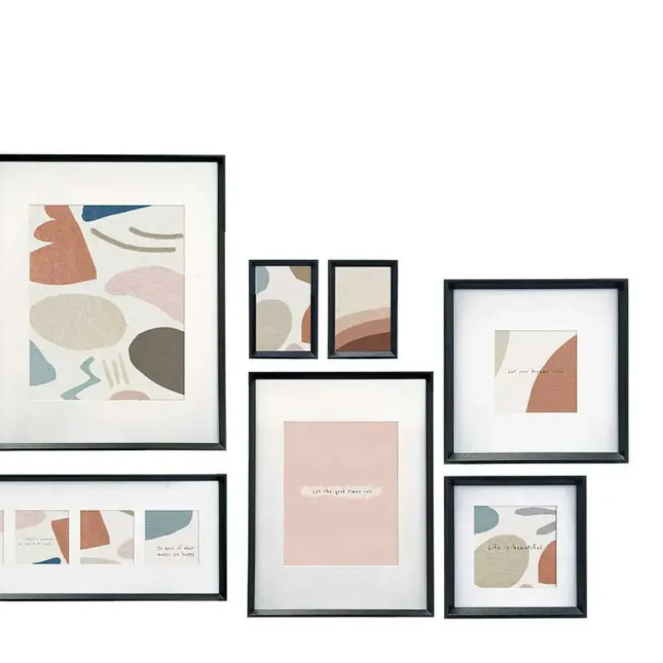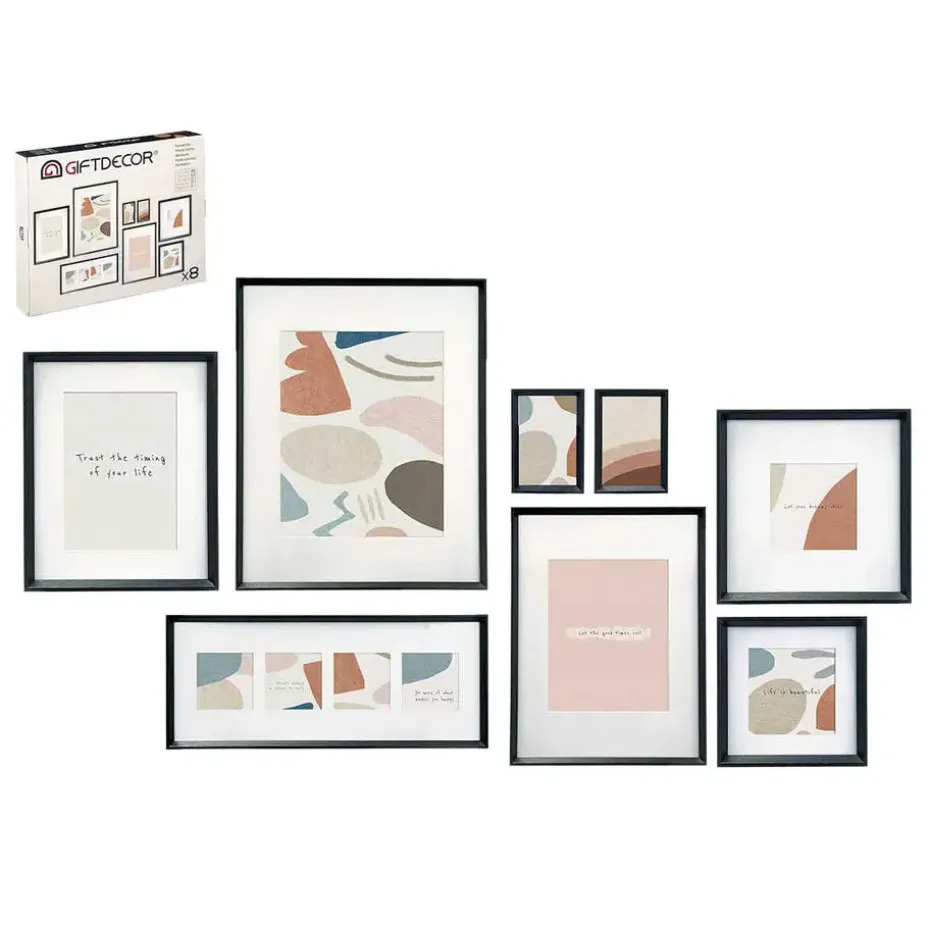 Collage fotolijst. Stel je foto’s tentoon met deze collage fotolijst met passe partout en randen in de kleur zwart. Deze moderne foto collage bestaat uit 8x fotolijstjes voor foto’s met afmetingen van 10×10 cm , 10×15 cm , 13×18 cm , 20×25 cm . Verticaal insteken. Materiaal: hout/glas. Merk: Gift Decor . Voorzien van ophangingen op deze op te hangen, zowel verticaal als horizontaal.