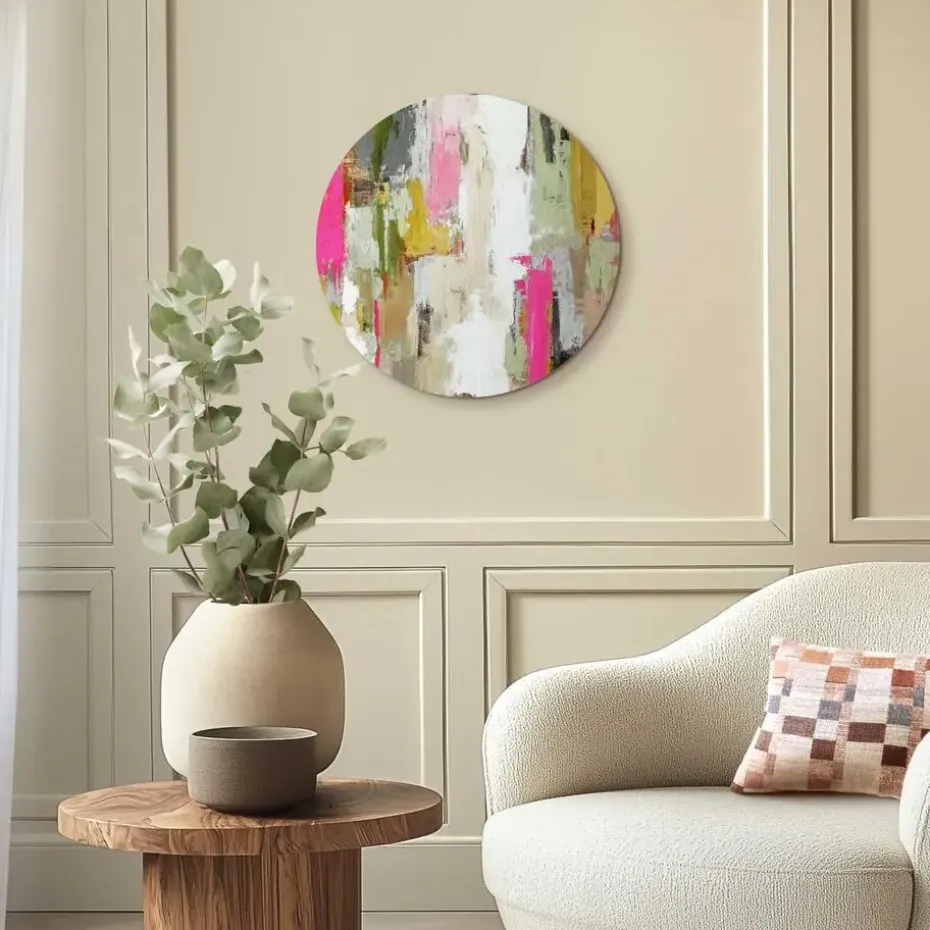 Print op 4mm dik ESG-veiligheidsglas, compleet met voorgemonteerde wandmontage en afstandhouders. De ronde vorm van de glasprint onderstreept op subtiele wijze het kenmerkende karakter van de afbeelding. Kenmerken