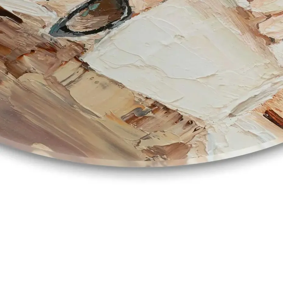 Print op 4mm dik ESG-veiligheidsglas, compleet met voorgemonteerde wandmontage en afstandhouders. De ronde vorm van de glasprint onderstreept op subtiele wijze het kenmerkende karakter van de afbeelding. Kenmerken