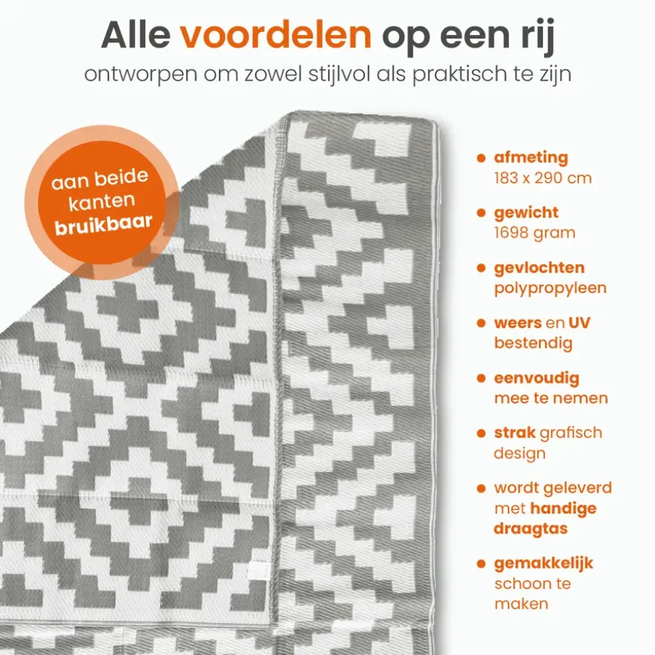 · Veelzijdig te gebruiken – Je kunt het buitenkleed zeer veelzijdig gebruiken. Zo kun je het kleed in de tuin neerleggen, op het terras neerleggen en zelfs op de camping gebruiken.
