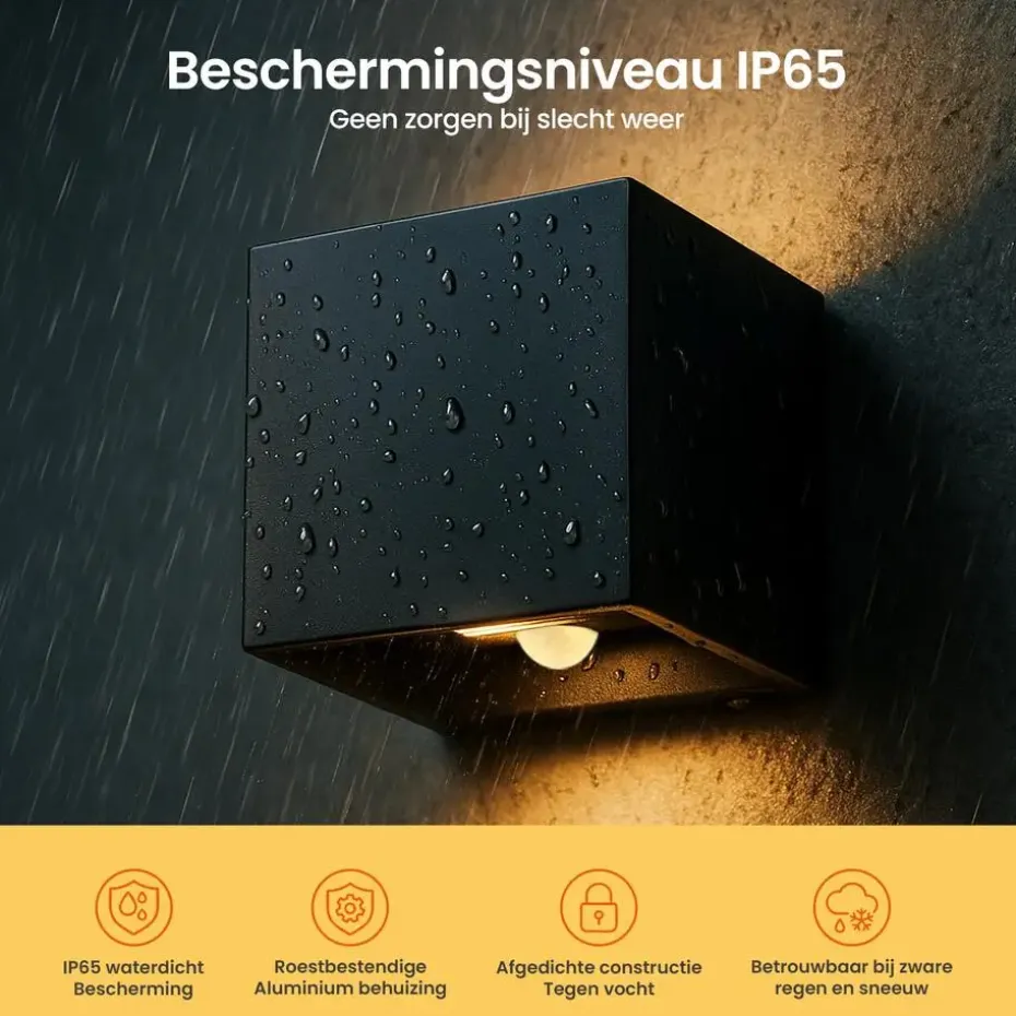Deze lamp heeft een IP65-score, wat betekent dat hij volledig waterdicht is en zonder problemen buiten kan worden geïnstalleerd. Ideaal voor: