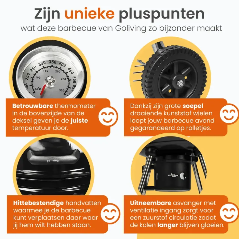 Dankzij de soepel draaiende wielen verplaats je deze barbecue zonder moeite naar elke gewenste plek in je tuin. Of je nu in de zon of in de schaduw wilt grillen, je verplaatst de Goliving barbecue in een handomdraai.