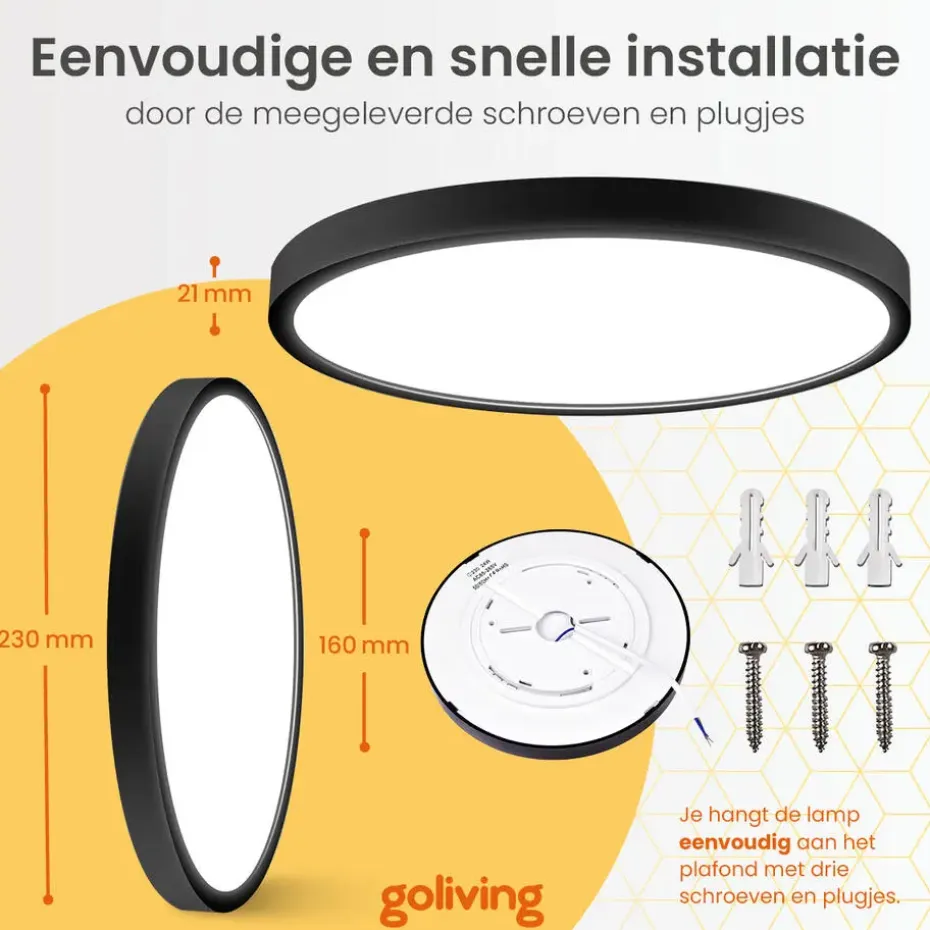 Op zoek naar een moderne, energiezuinige plafondlamp voor de badkamer, woonkamer of slaapkamer? De Goliving LED plafondlamp biedt krachtige verlichting, een strak design en drie instelbare lichtkleuren waarmee jij in één klik de perfecte sfeer creëert. Dankzij het ultradunne ontwerp, de hoge lichtopbrengst en het eenvoudige montagesysteem is deze plafonniere ideaal voor iedere ruimte in huis.