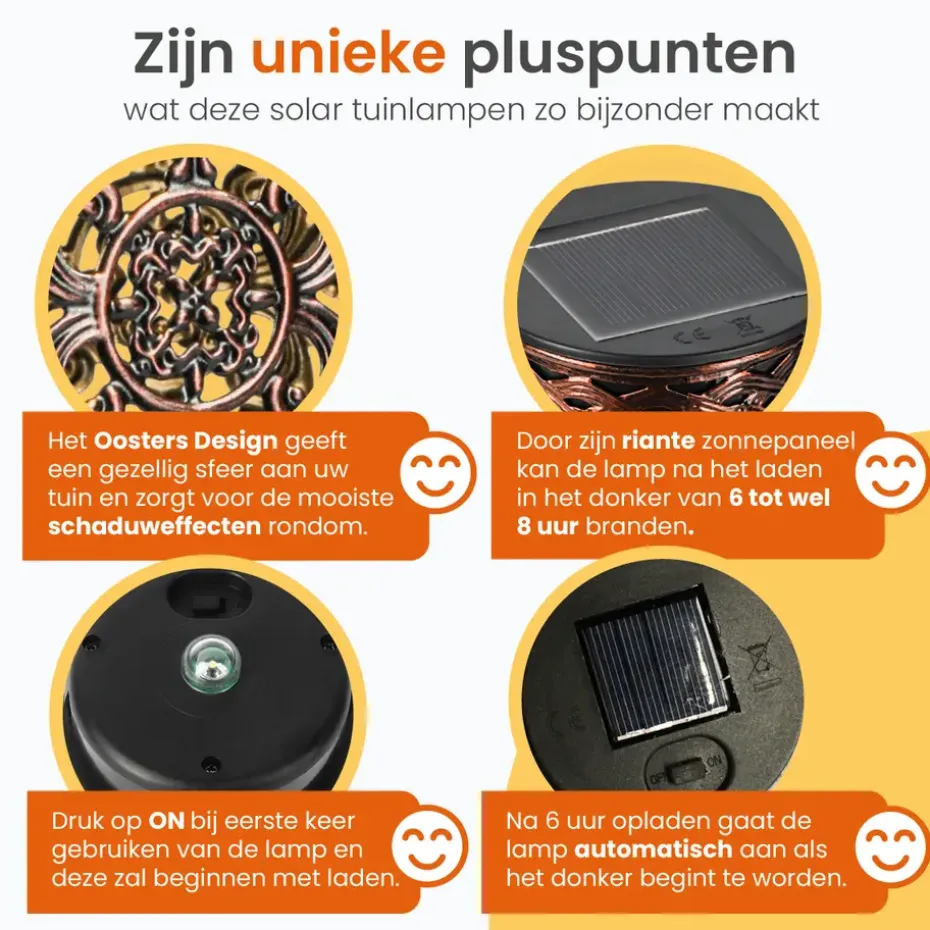 Met de handige automatische aan/uit schakelfunctie hoef je nooit meer te denken aan het aanzetten van de verlichting. De lampen gaan vanzelf aan bij schemering en weer uit bij zonsopgang, wat zorgt voor een zorgeloze sfeerbeleving.