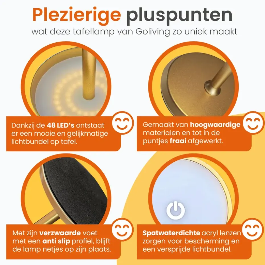 Dankzij de 48 ingebouwde LED lampjes zorgt de lamp voor een goede verlichting die ideaal is om bij te dineren, lezen of gezellig te borrelen. Je kunt de lamp hierdoor gebruiken als werklicht én als sfeerlicht. De lamp is voorzien van een krachtige batterij, waardoor de lamp tot wel 20 uur kan branden zonder tussendoor opgeladen te hoeven worden.
