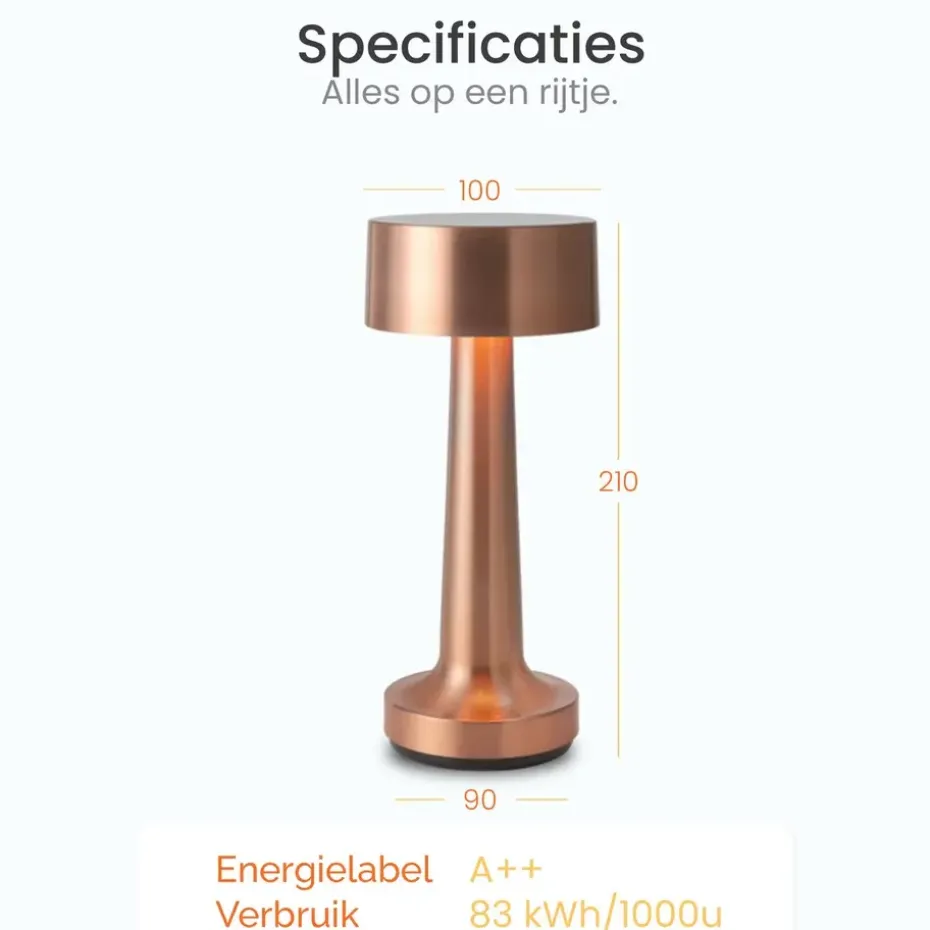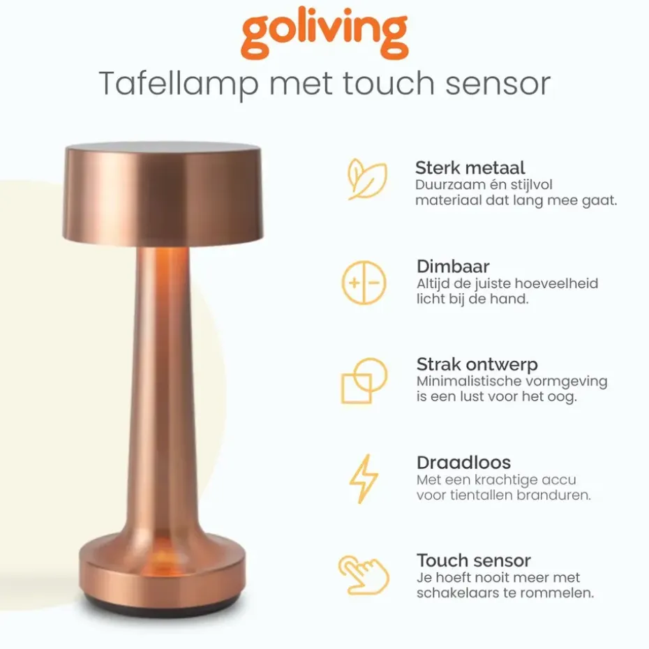De draadloze Goliving tafellamp is een moderne lichtbron voor in elke ruimte. Van een slaapkamer-tafellamp of nachtlampje, tot de woonkamer: deze tafellamp komt overal tot zijn recht. De lamp is in strak metaal uitgevoerd, en je bedient hem met één subtiele aanraking. De lamp heeft drie standen van sfeervol warm licht, tot kraakhelder wit. De batterij van de lamp heeft bovendien een zeer lange adem: Tot wel 20 uur!