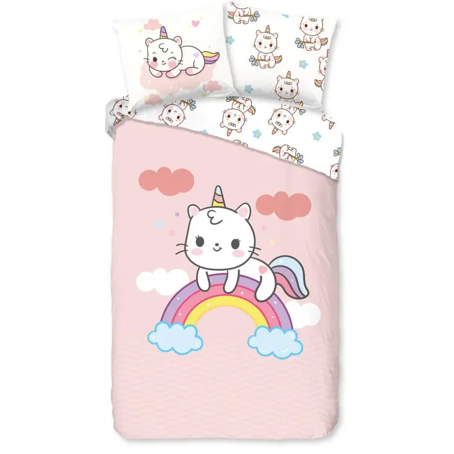 Kinderdekbedovertrek “Puk” van Good Morning met eenhoorn kat met regenboog, in de kleur “Roze” is gemaakt van 100% katoen. Deze kwaliteit is ademend, vochtabsorberend en voelt zacht en soepel aan. Dit leuke kinderdekbedovertrek is een toevoeging aan iedere kinderkamer en is geschikt voor ieder jaargetijde. Het katoenen dekbedovertrek is heerlijk koel in de zomer en geeft warmte in de winter.