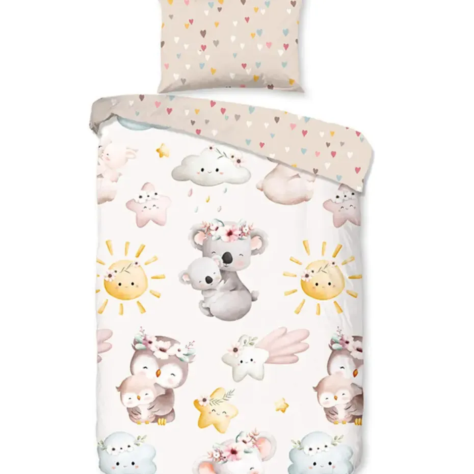 Laat je meevoeren in een wereld vol liefde en warmte, waarin schattige koala’s en uiltjes met bloemkroontjes de hoofdrol spelen. Om hen heen zweven zachte wolkjes, speelse sterretjes en glinsterende zonnetjes, elk met hun eigen lieve glimlach. Het palet – van lichtroze en mintblauw tot beige en okergeel – straalt rust en harmonie uit.
