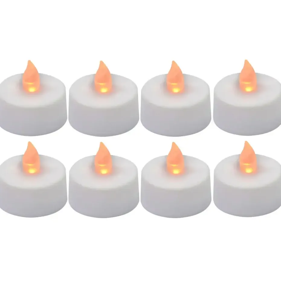 Deze set bevat 8 flikkerende LED waxinekaarsjes die veilig en sfeervol licht geven zonder echte vlam. Elk theelichtje werkt op een inbegrepen CR2032 celbatterij en heeft een handig aan/uit-schakelaartje aan de onderkant.