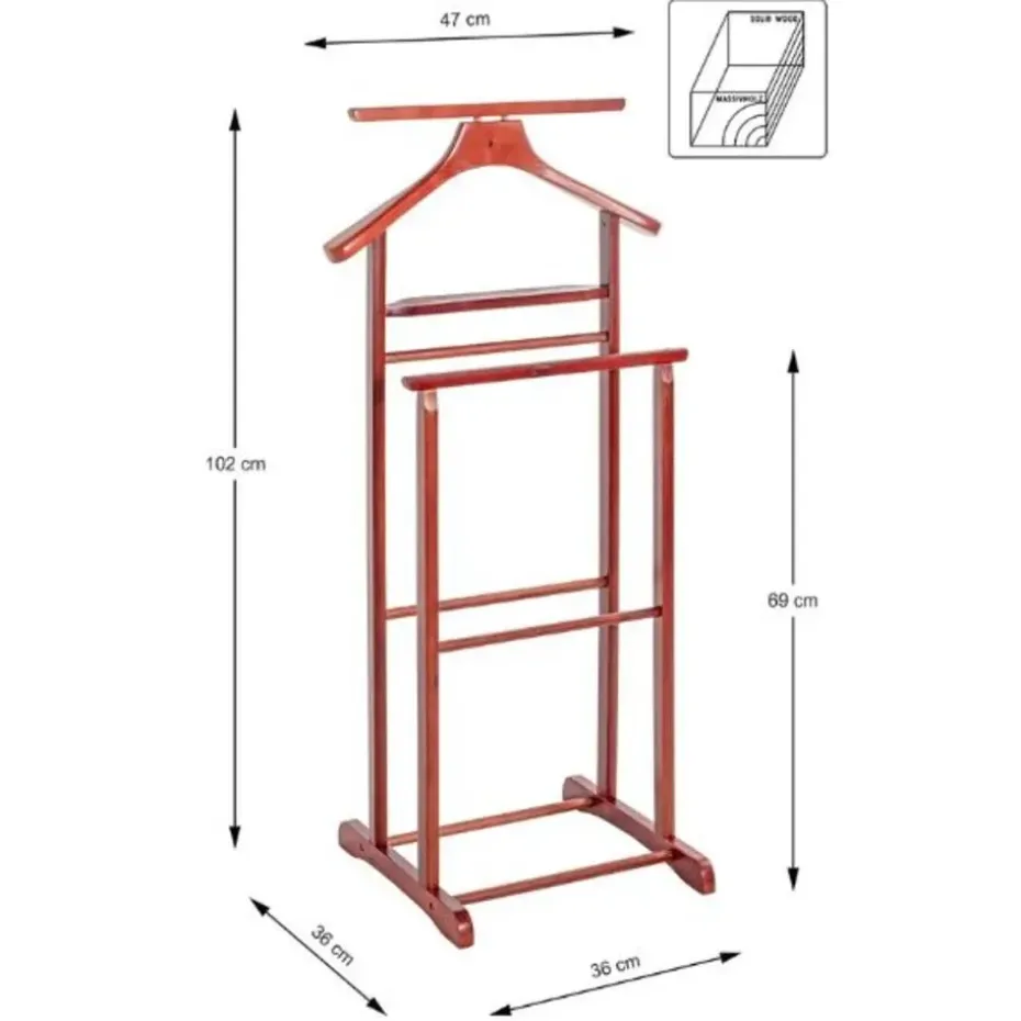 Dit kledingrek is de perfecte aanvulling voor elke slaapkamer of kleedkamer. Gemaakt van massief hout met een prachtige kersenhouten lakafwerking is deze kapstok niet alleen stijlvol maar ook duurzaam. Met een draagvermogen van 8 kg kan hij al je pakken, overhemden en broeken comfortabel opbergen zonder om te vallen. De kapstok is ideaal om je kleding kreukvrij en georganiseerd te houden, zodat je je ’s ochtends snel kunt aankleden. Verfraai je garderobe vandaag nog met deze elegante en functionele kleerhanger!