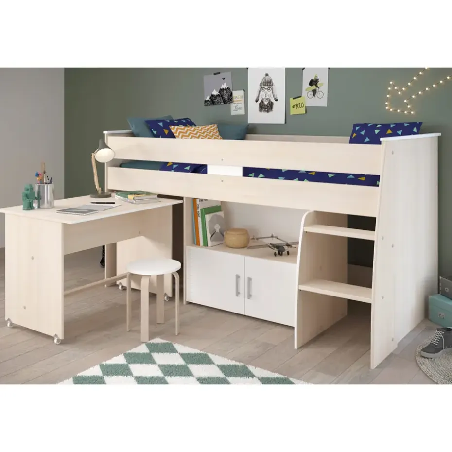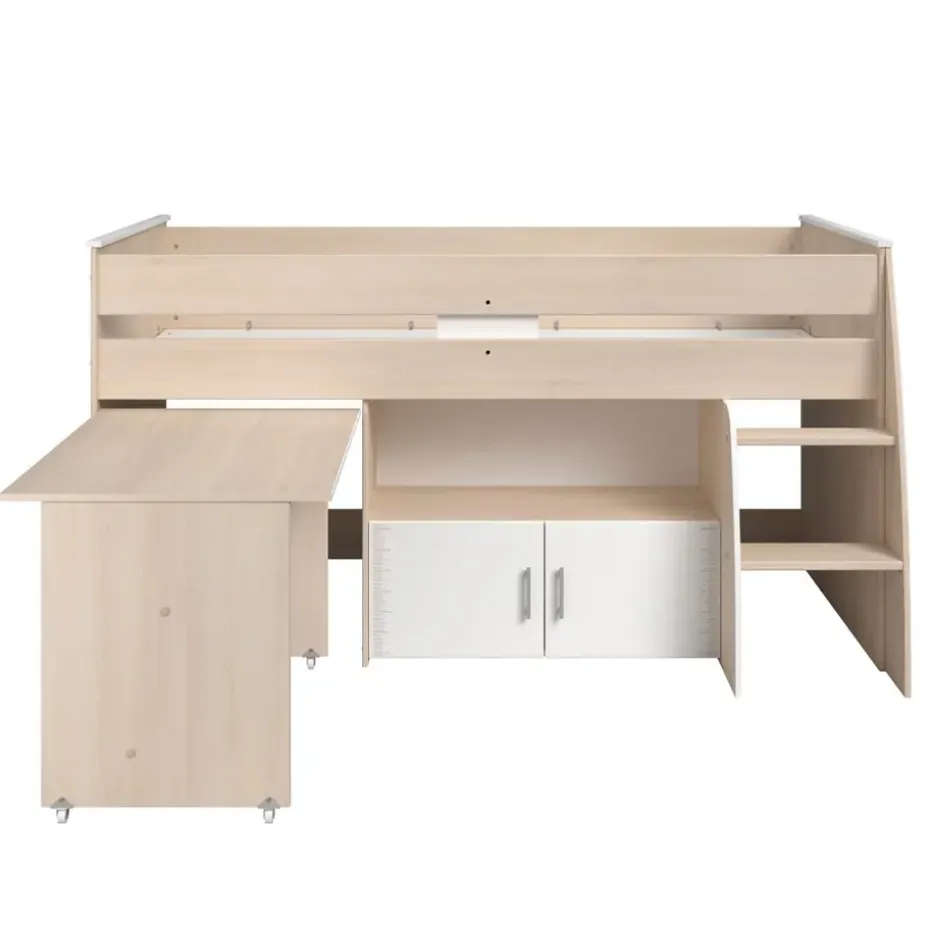 Halfhoogslaper Charly is zeer geschikt voor een opgroeiend kind. Het staat niet alleen leuk en gezellig, je bespaart ook nog eens ruimte. Halfhoogslaper Charly is een bed in acaciakleur met een totale afmeting van 110×113,8×206,3 cm. Het bed is geschikt voor een matras van 90×200 cm. Halfhoogslaper Charly heeft een moderne uitstraling, maar het past in vrijwel ieder interieur. Omdat het bed diverse opbergmogelijkheden biedt, zoals kastjes, heb je genoeg ruimte om diverse spulletjes op te bergen.