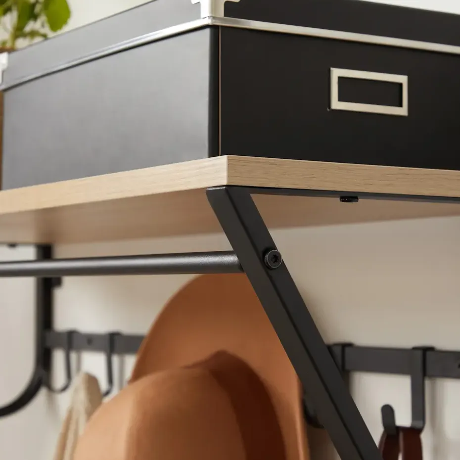 Deze kapstok combineert verschillende ophang- en opbergmogelijkheden met een plank, een rail en meerdere haken. De kapstok neemt weinig ruimte in beslag, maar is toch zeer praktisch. De kapstok heeft een leuke lichte toets waardoor ze een echte eyecatcher zal zijn in uw hal, badkamer of woonkamer.