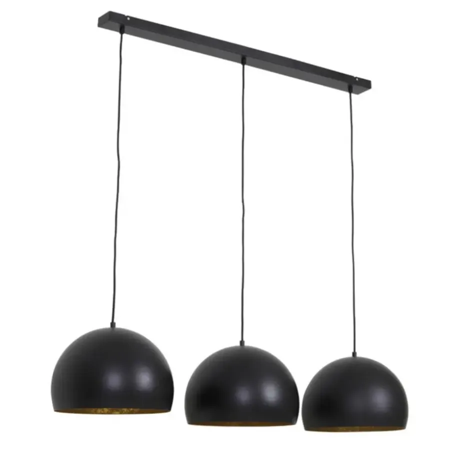 Deze trendy zwarte Jaicey hanglamp bestaat uit 3 lampen met een diameter van 45 cm, waardoor er een gezellige sfeer ontstaat in uw woonkamer of eetkamer. Naast het verlichten van uw woning, creëert de lamp een robuuste en moderne look met zijn metalen elementen. De metalen lampenkappen hebben een gouden afwerking, hangen aan een goudkleurig stoffen snoer en zijn in hoogte verstelbaar.