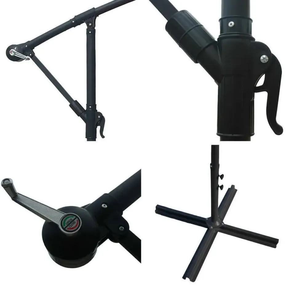 Wat de accessoires betreft, is het noodzakelijk ballast of opvulbare platen toe te voegen om ervoor te zorgen dat het op zijn plaats blijft. Happy Garden adviseert u ook om uw excentrieke parasol te beschermen met een hoes wanneer u hem niet gebruikt, zodat hij beschermd is tegen slecht weer.
