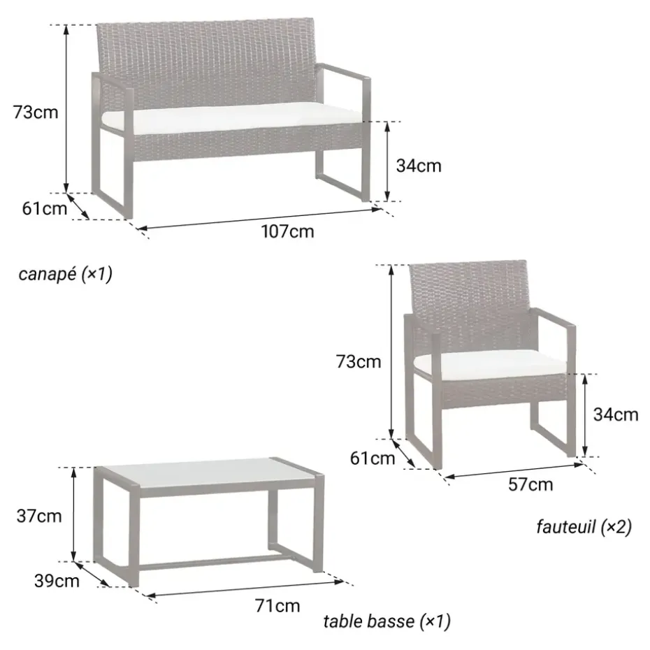 De tuinmeubelset MAJORQUE bestaat uit: 1 bank, 2 fauteuils, 1 salontafel