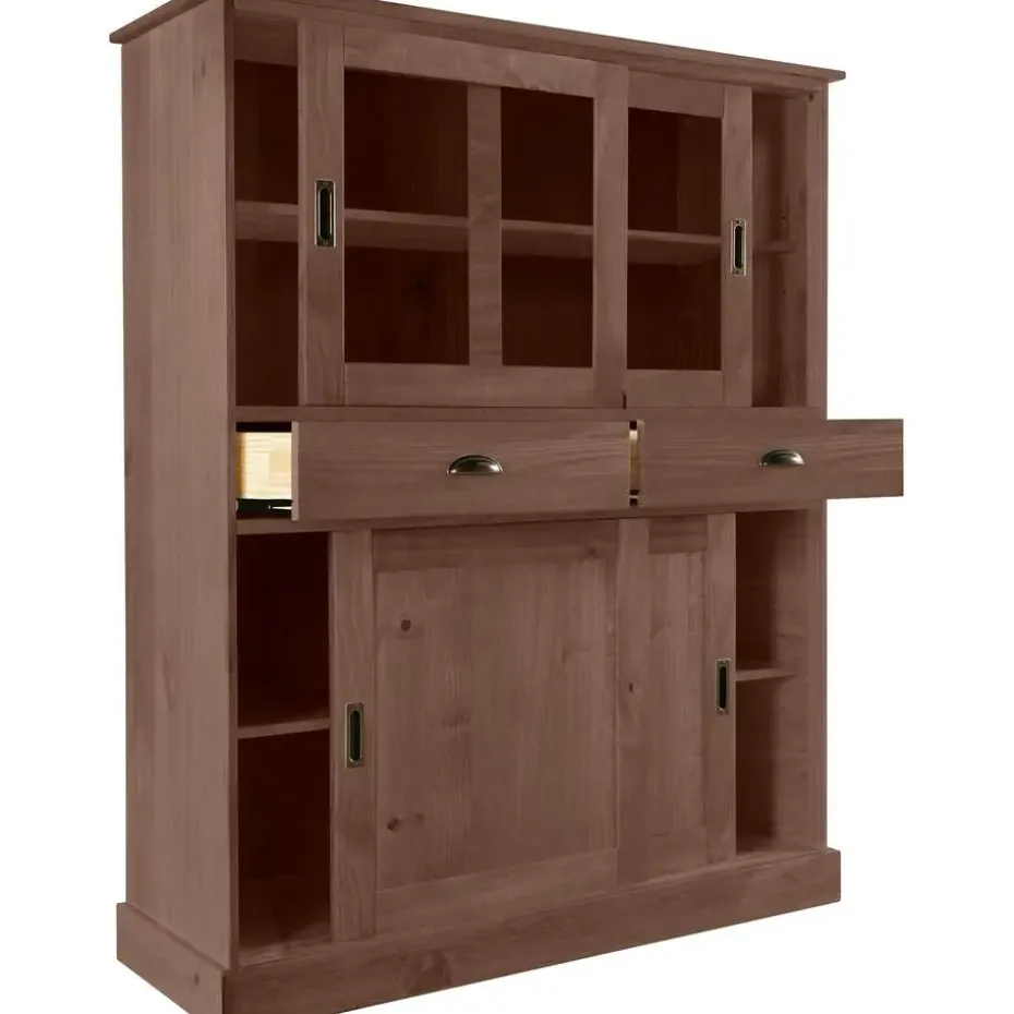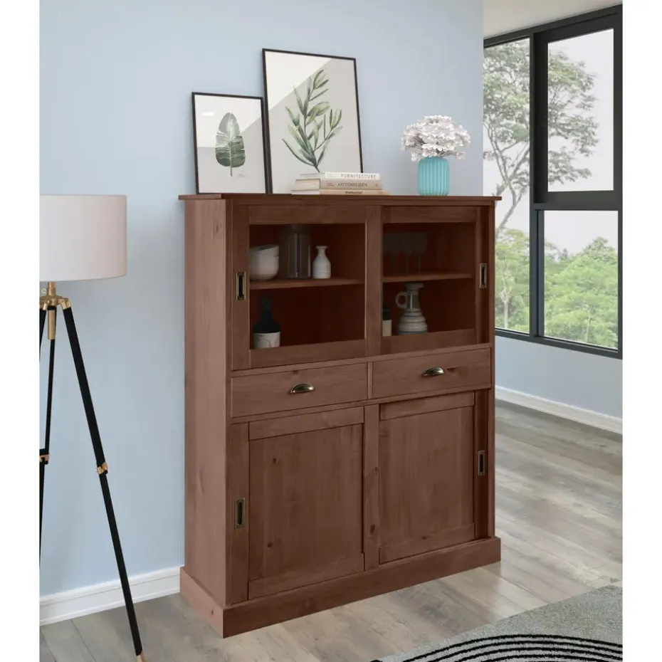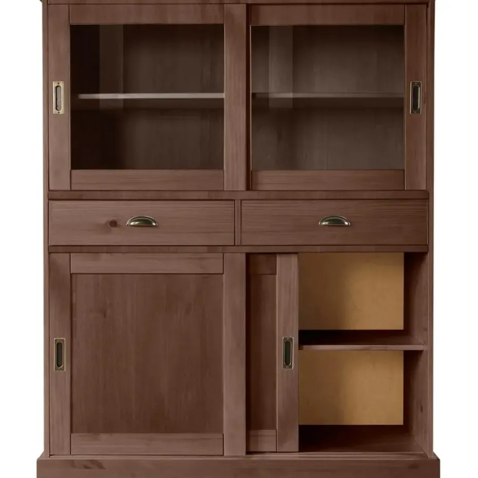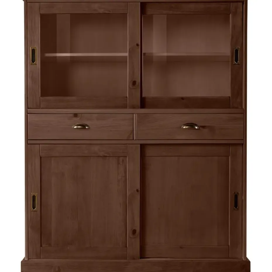 Deze kast is gemaakt van massief bruin grenenhout en heeft twee glazen deuren en twee houten deuren. De verstelbare planken bieden voldoende opbergruimte voor boeken, servies of decoratieve items. De glazen deuren geven een elegante uitstraling en maken het gemakkelijk om de inhoud te zien. De kast is stevig en duurzaam, ideaal voor elke kamer in huis.
