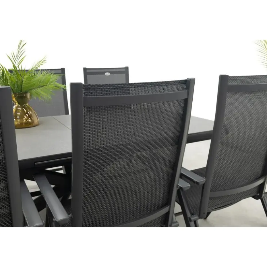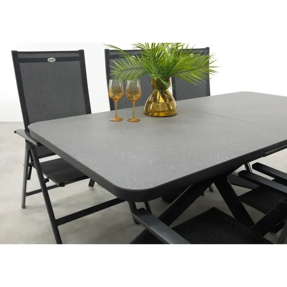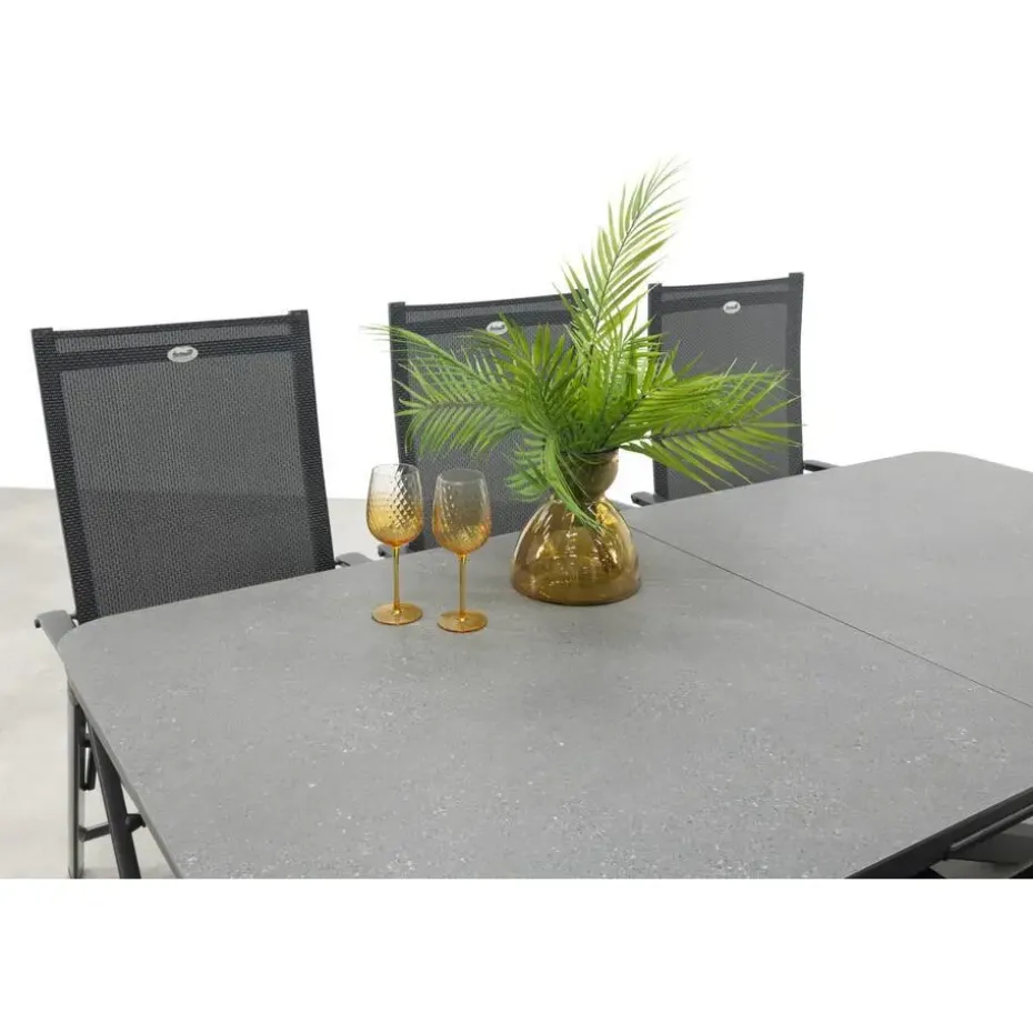 De Montreal tuintafel maakt het plaatje compleet. Het aluminium onderstel met antracietkleurige coating is niet alleen sterk en weerbestendig, maar ook verrassend licht. Het keramieken tafelblad in betonlook geeft een stoere, moderne uitstraling en is krasvast, hittebestendig en makkelijk schoon te maken. Dankzij het slimme uitschuifmechanisme verleng je de tafel moeiteloos van 200 naar 260 cm, perfect voor extra gasten. De afgeronde hoeken en verstelbare pootdoppen zorgen voor gebruiksgemak én een stijlvolle afwerking.