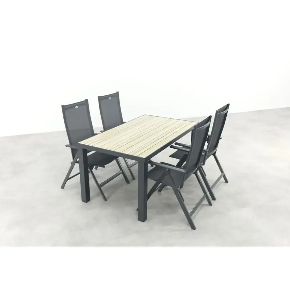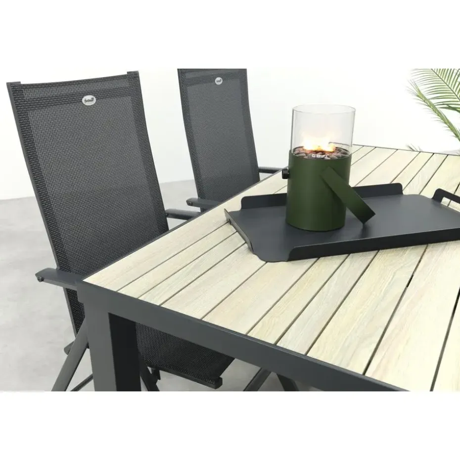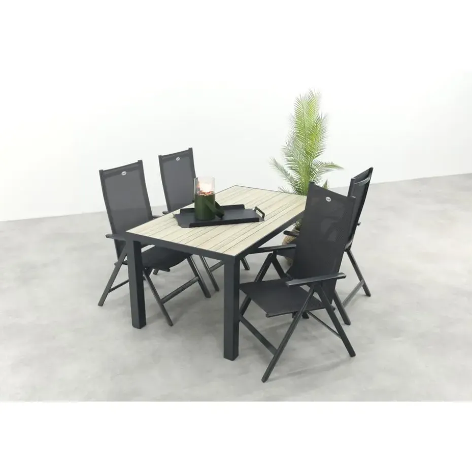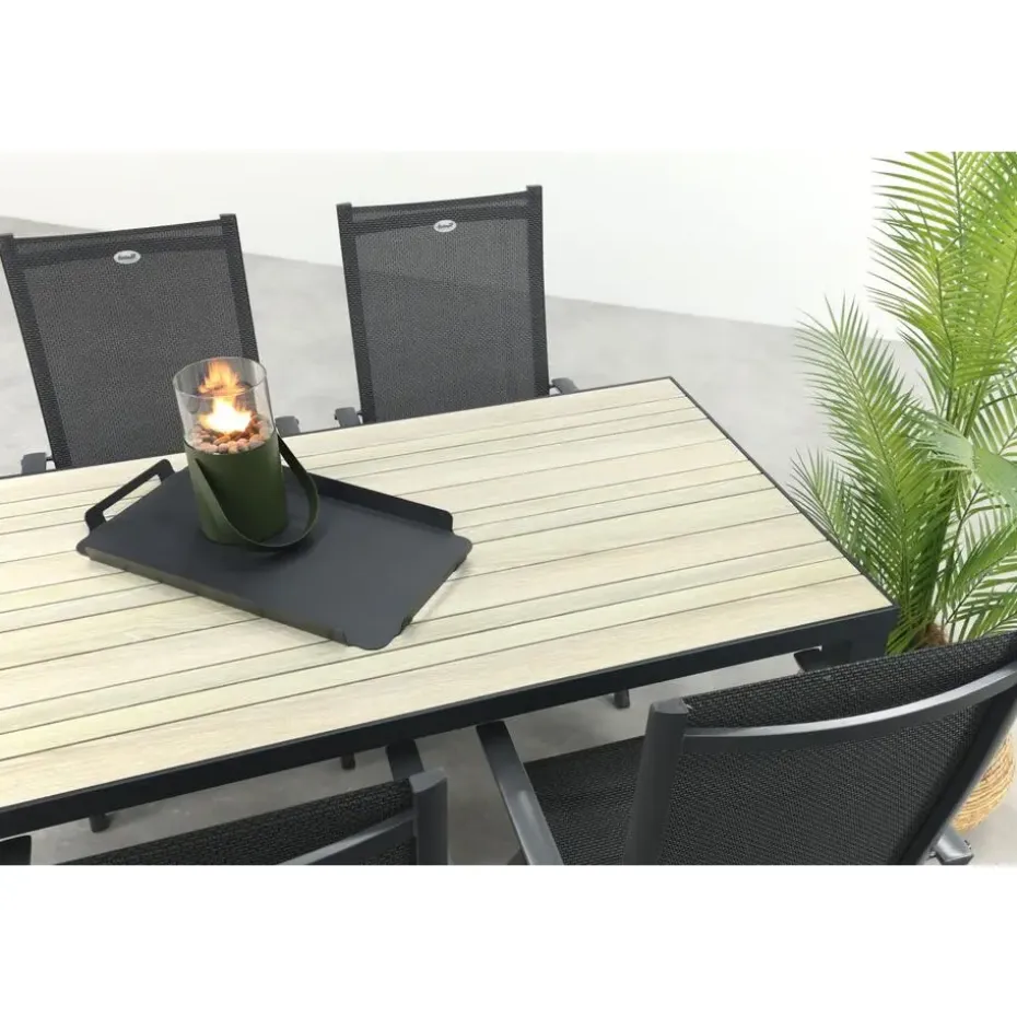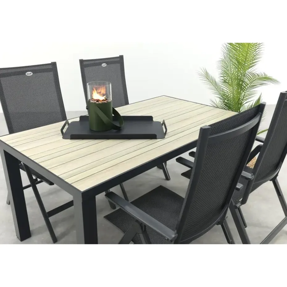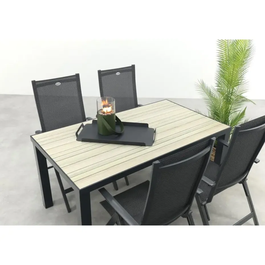 De Nola tuintafel is gemaakt van aluminium, een materiaal dat bekendstaat om zijn stevigheid en weerbestendigheid. Het tafelblad heeft een realistische houtlook die zorgt voor een warme en natuurlijke sfeer in je tuin, zonder het onderhoud dat echt hout vereist. Regen, zon of wind? Geen probleem, deze tafel blijft er mooi uitzien. De afmeting van 160×90 cm biedt voldoende ruimte voor gezellige diners of borrels. En goed om te weten: de Nola is ook verkrijgbaar in twee andere formaten (90x90en210x90 cm.), zo kies je altijd de maat die past bij jouw tuin.
